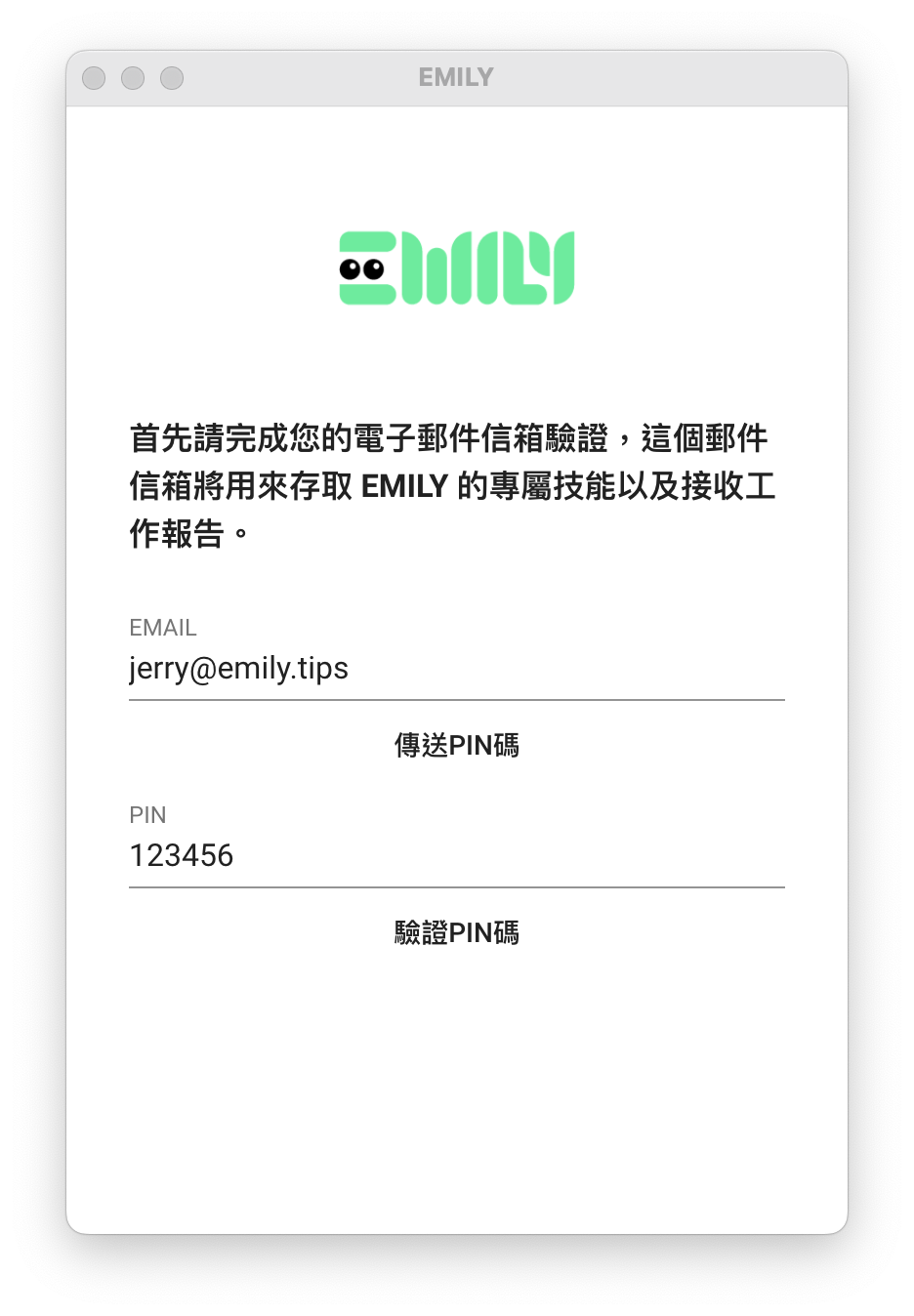 你輸入的電子郵件信箱將成為你的 EMILY 帳號,在按下傳送PIN碼後,請耐心等候幾分鐘,你將收到一封電子郵件內含六位數的 PIN 碼,請回填 EMILY 的註冊畫面並且點擊驗證,就能完成註冊程序。