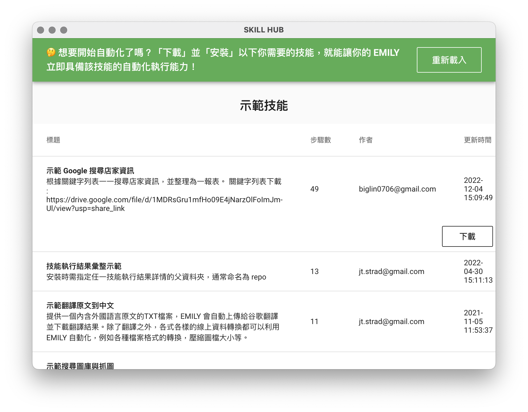 完成註冊後,點擊畫面右上方下載技能圖示會開啟一個瀏覽器視窗 SKILL HUB(如下圖),請下載一個示範技能,例如示範 Google 搜尋店家資訊: