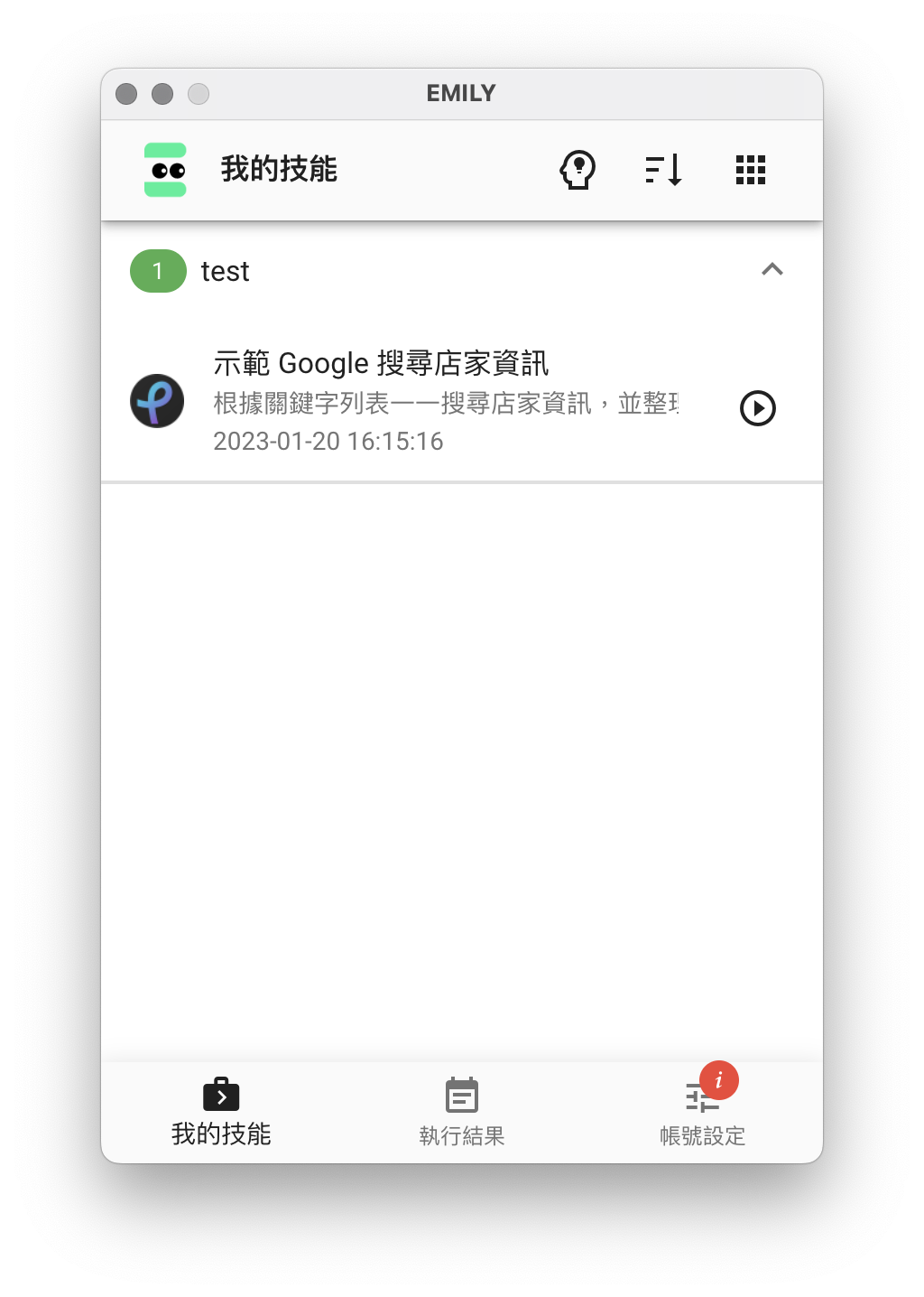 現在 EMILY 機器人已經取得下載的技能,點擊右側的執行按鈕開始自動操作。
