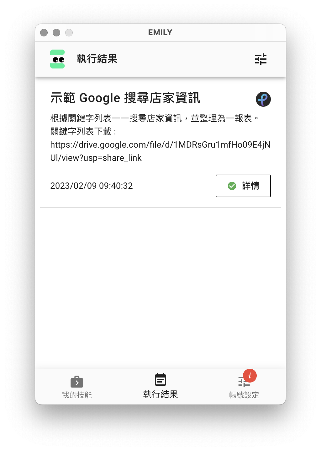 恭喜你完成第一次的自動化!很簡單對吧?現在你可以在執行結果中找到剛才完成的自動化,點入詳情就能看到 EMILY 執行工作產生的結果。