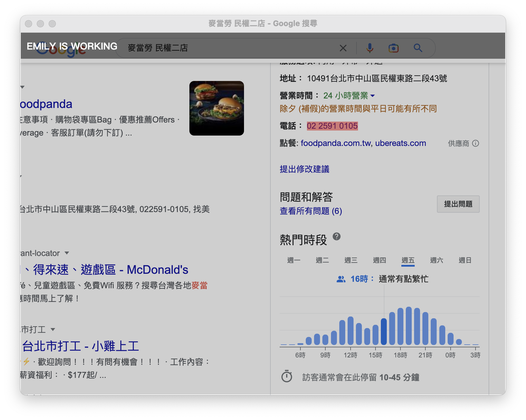 你會看到出現一個自動化執行技能的瀏覽器視窗,在倒數幾秒後 EMILY 會自動根據你提供的 keywordList.csv 檔案逐一到 Google 搜尋店家,然後複製設定好的幾項店家資訊,最後彙整成一個輸出表格。