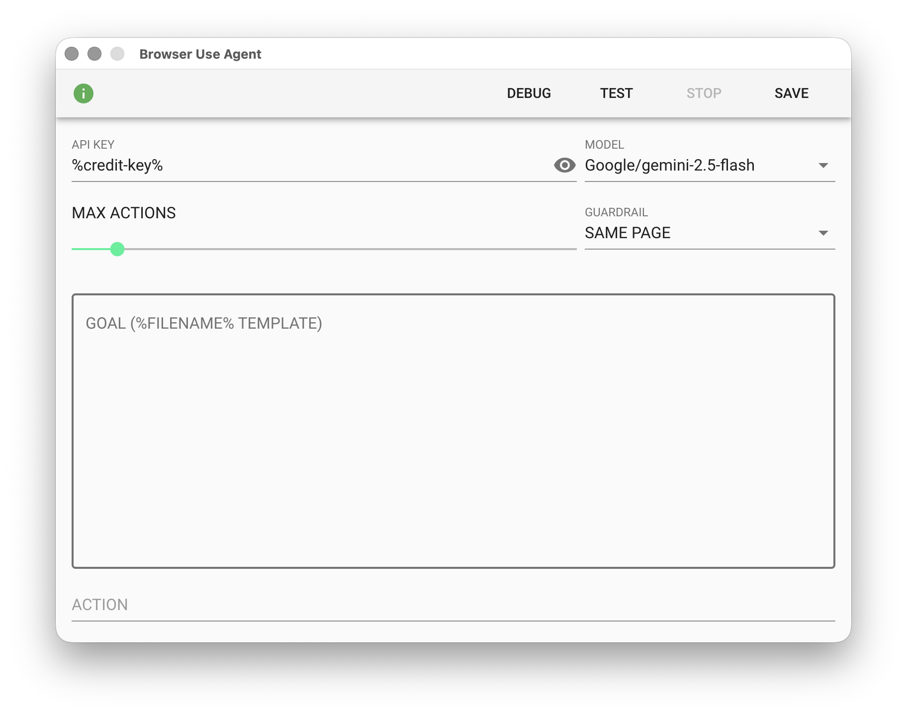 ACTION - 由模型判斷並執行的下一步瀏覽器操作。每個步驟都會自動擷取螢幕畫面,並儲存至工作資料夾中以供追蹤與檢視。