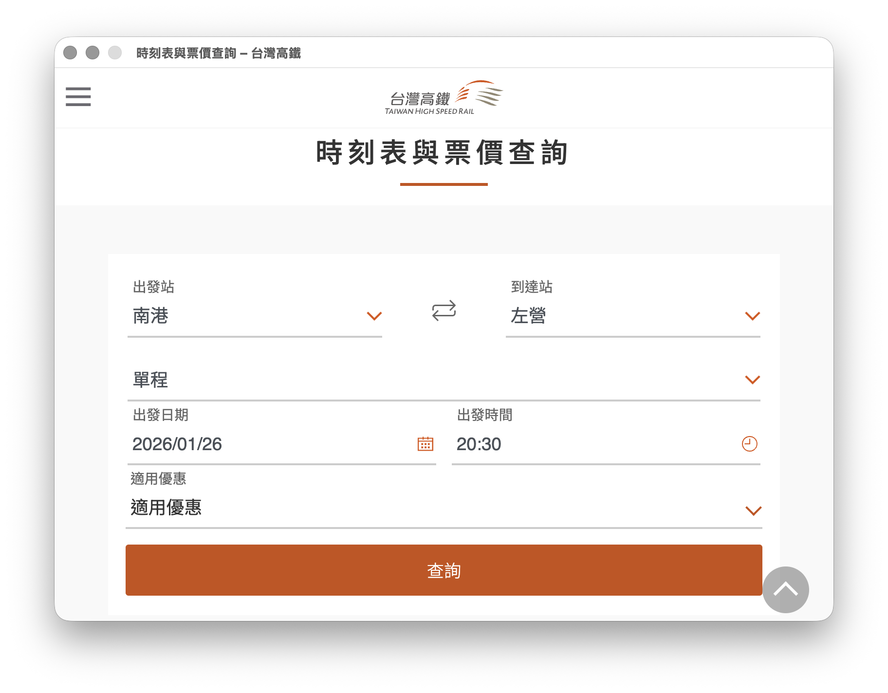 以這個查詢高鐵班車時刻為例,查詢網頁預設從「南港」出發抵達「左營」,日期是 2026/01/26,時間為 20:30。