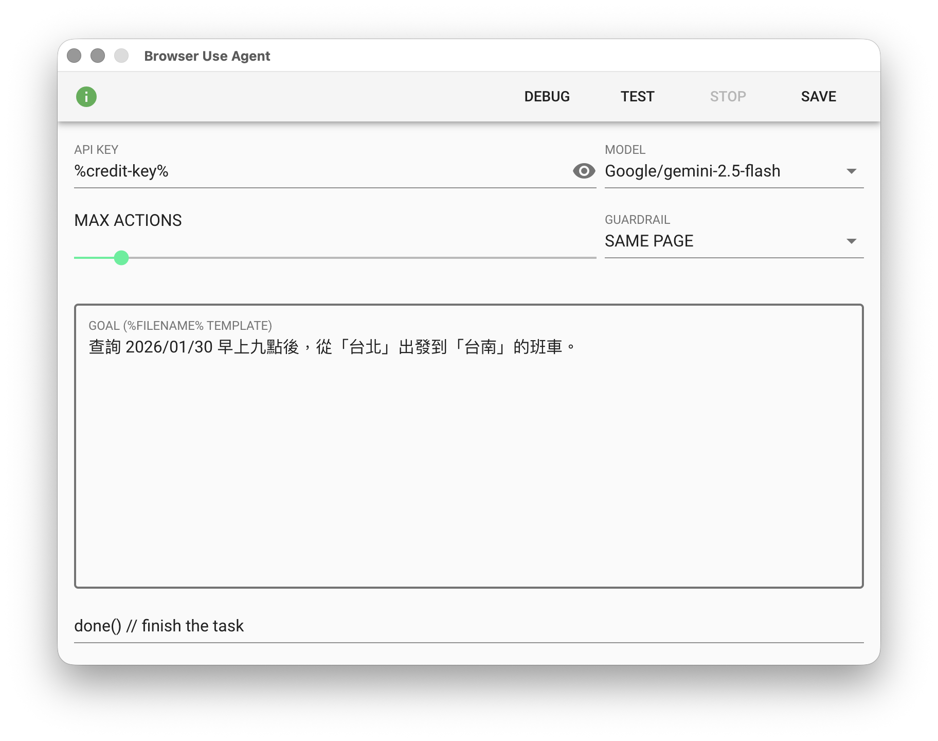 Browser Use Agent 以自然語言描述任務目標,並透過大型語言模型(LLM)自主操作瀏覽器。需注意越大的目標語言模型越容易產生誤判,也會使用更多的 Token,建議拆解成多個小任務來降低失敗率。