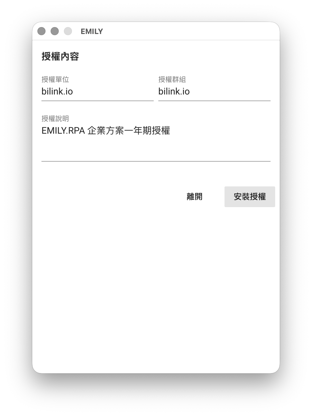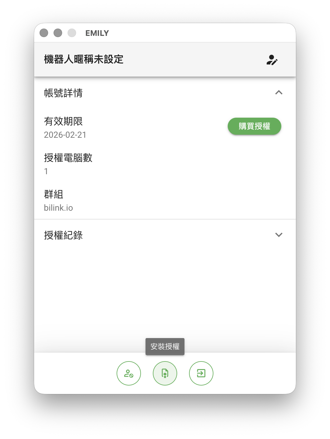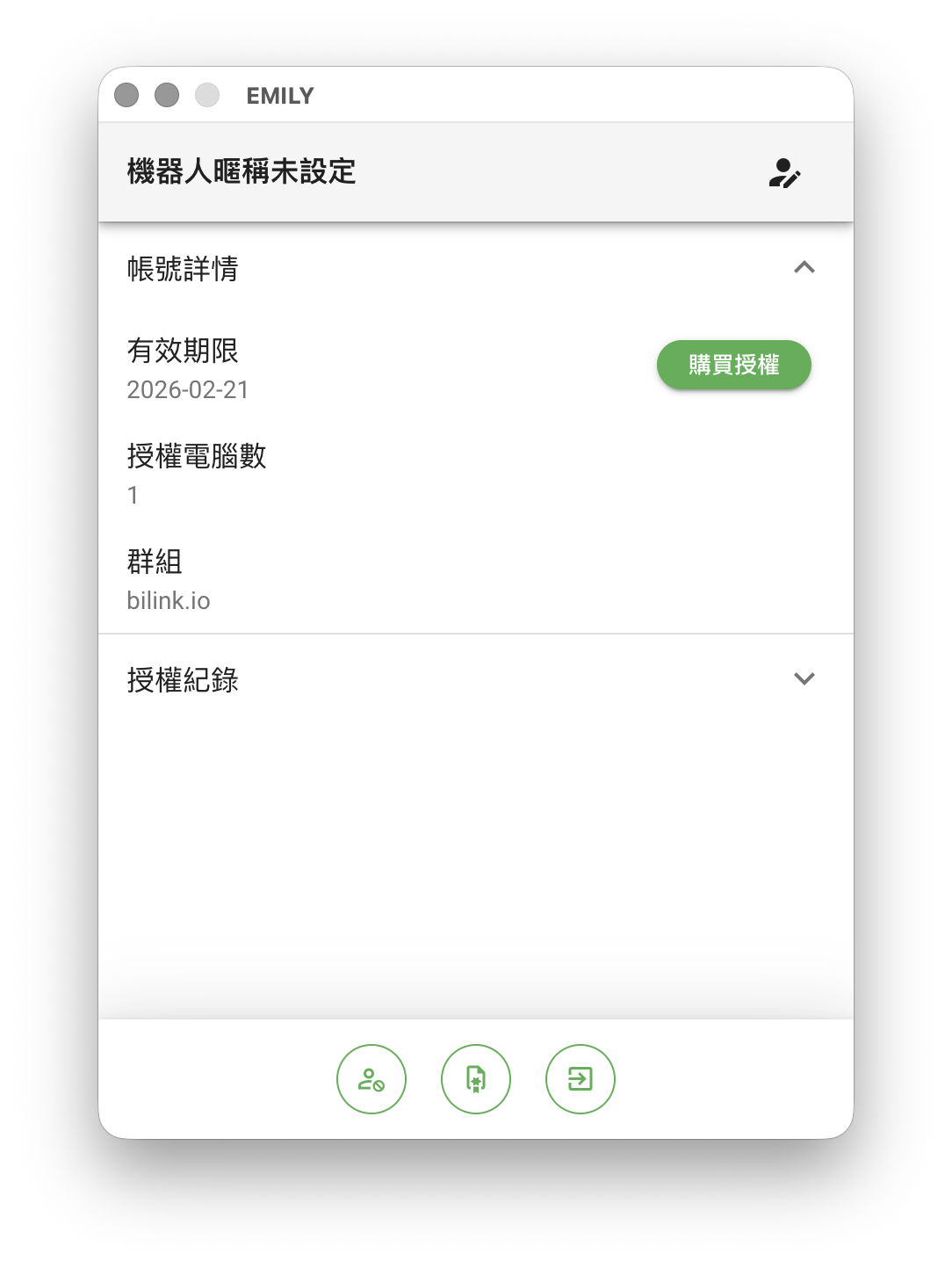 點擊帳號項目後會進入帳號詳情頁,內容包含「有效期限」、「授權電腦數」、「群組」以及「授權記錄」。其中授權電腦數與群組需要企業方案才能設定,授權電腦預設都是一台,也就是同時間只能在一台電腦打開 EMILY.RPA,群組功能則是提供企業多個帳號間的技能共用與權限管理,可聯繫您的商務窗口。