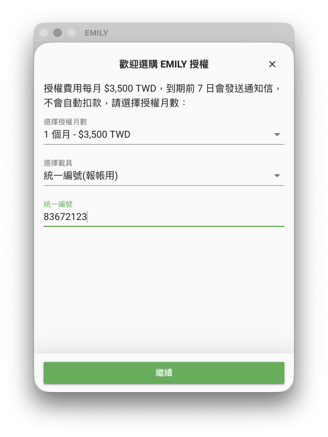 「購買授權」提供單次線上刷卡購買帳號授權,可以自行選擇授權期限長度,到期只會通知不會自動扣款。如果需要報帳可以在「選擇載具」選統一編號,或者選載具兌獎。