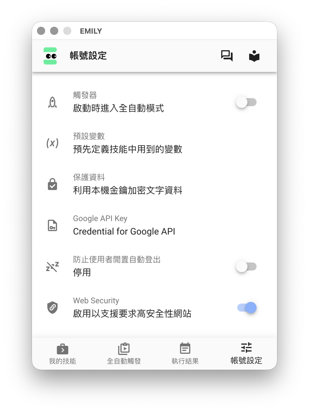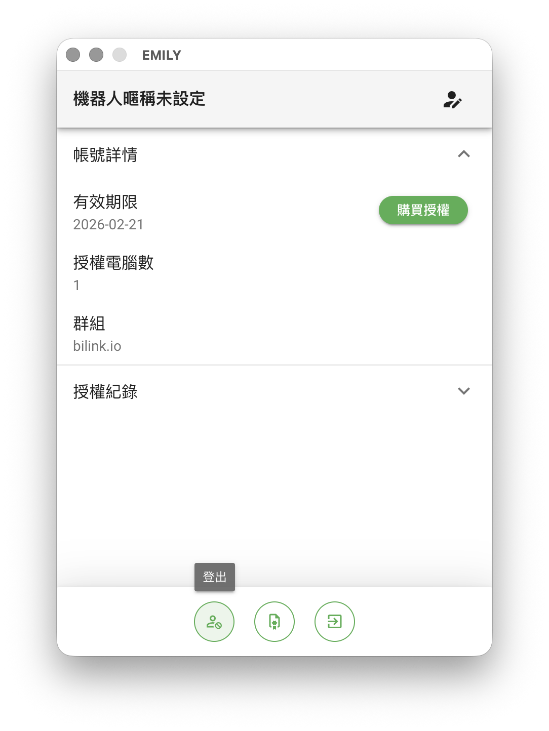 如果安裝 EMILY.RPA 的電腦不想再用目前帳號了,可以在下方「登出」帳號。請注意登出帳號日後如果再註冊登入本機,安裝的技能必須重新從技能庫下載。