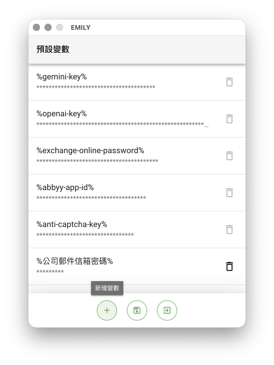 「預設變數」可以將常用的輸入資訊儲存成一個變數,可以用在自動化各種系統的帳號、密碼、或金鑰上。企業方案另外還提供群組共用的變數,可以讓群組內帳號使用而不會外洩明碼。