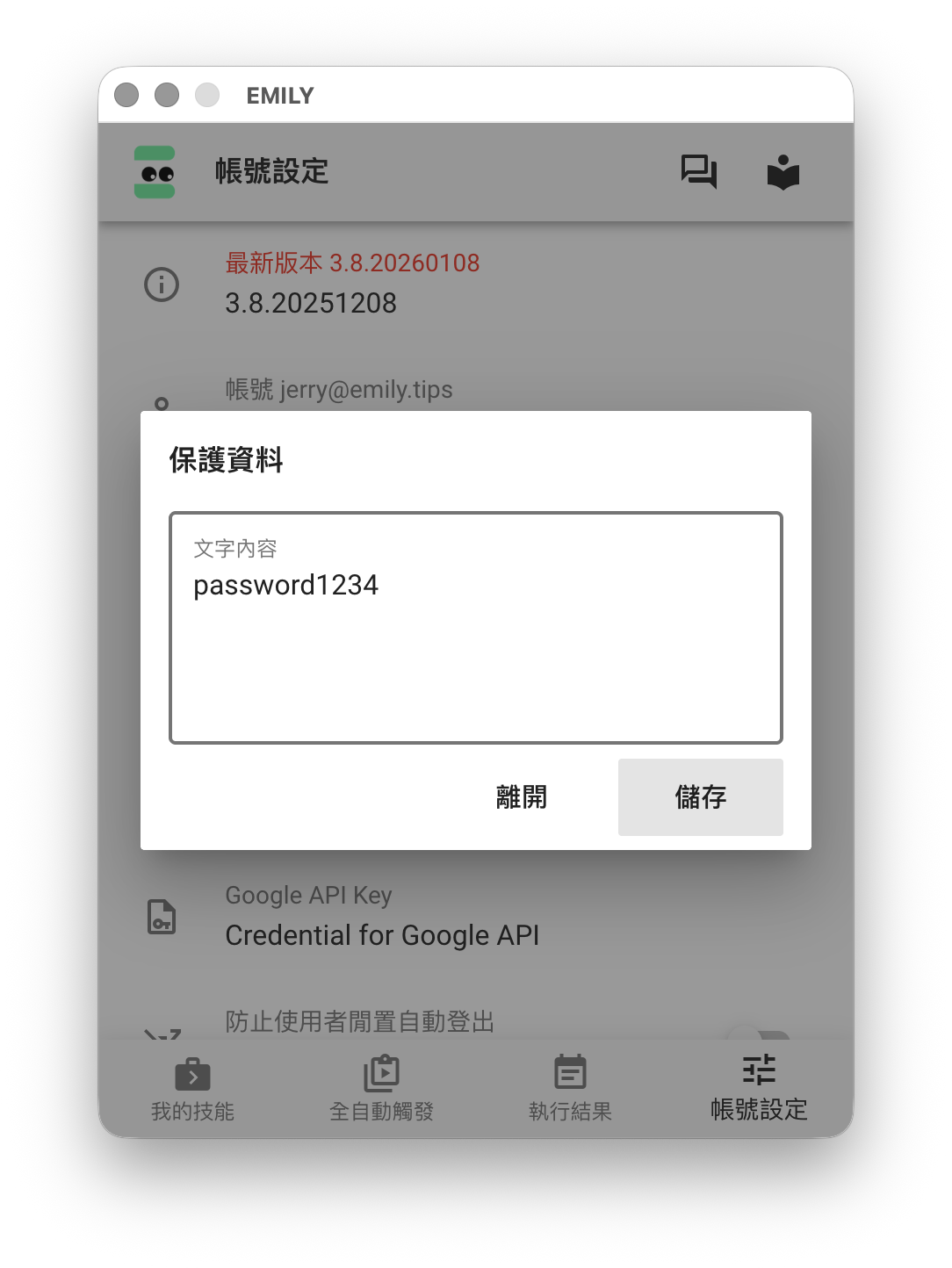 進入「保護資料」對話框可以輸入需要保護的文字資料,例如密碼,EMILY.RPA 會用作業系統保護的金鑰加密,然後儲存成密文。這個密文文字檔使用在技能中才會被即時解碼,不會留存明碼。