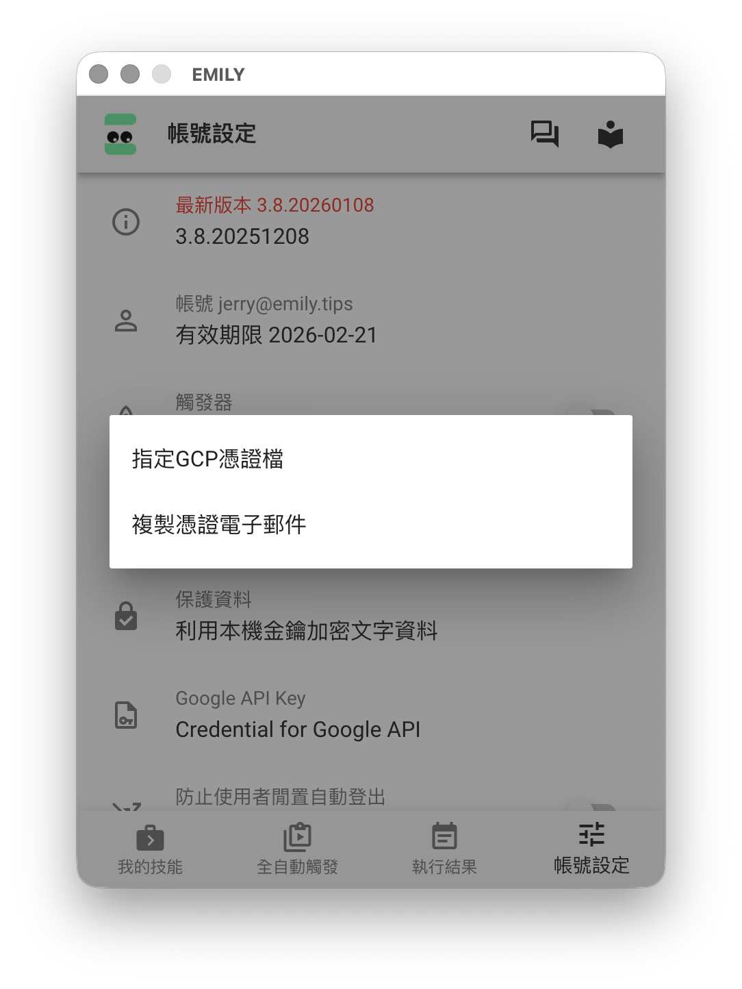 EMILY.RPA 的帳號授權、版本更新、以及其他設定都在「帳號設定」功能頁。可更新版本(如果有的話)、版本號碼、帳號名稱與授權有效期限可以直接在頁面項目上找到。
