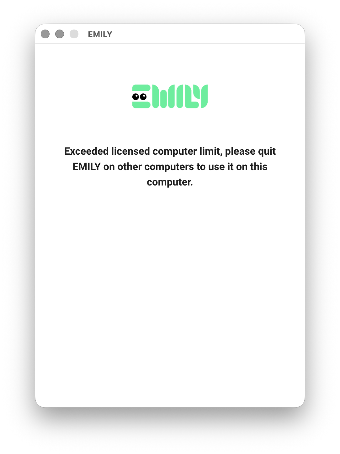 If you see the following screen, it means another computer registered with the same account is currently running EMILY.RPA and you have reached your "Licensed Devices" limit. You will need to close EMILY.RPA on the other computer before you can log in on the current one. You may also contact us to purchase additional device licenses — this feature is available for enterprise customers.