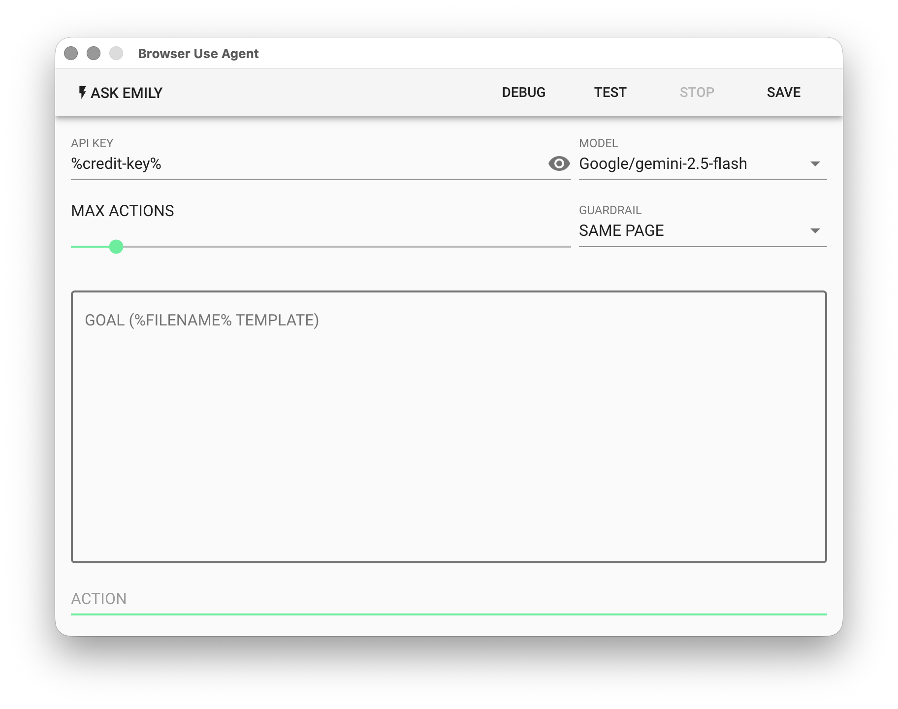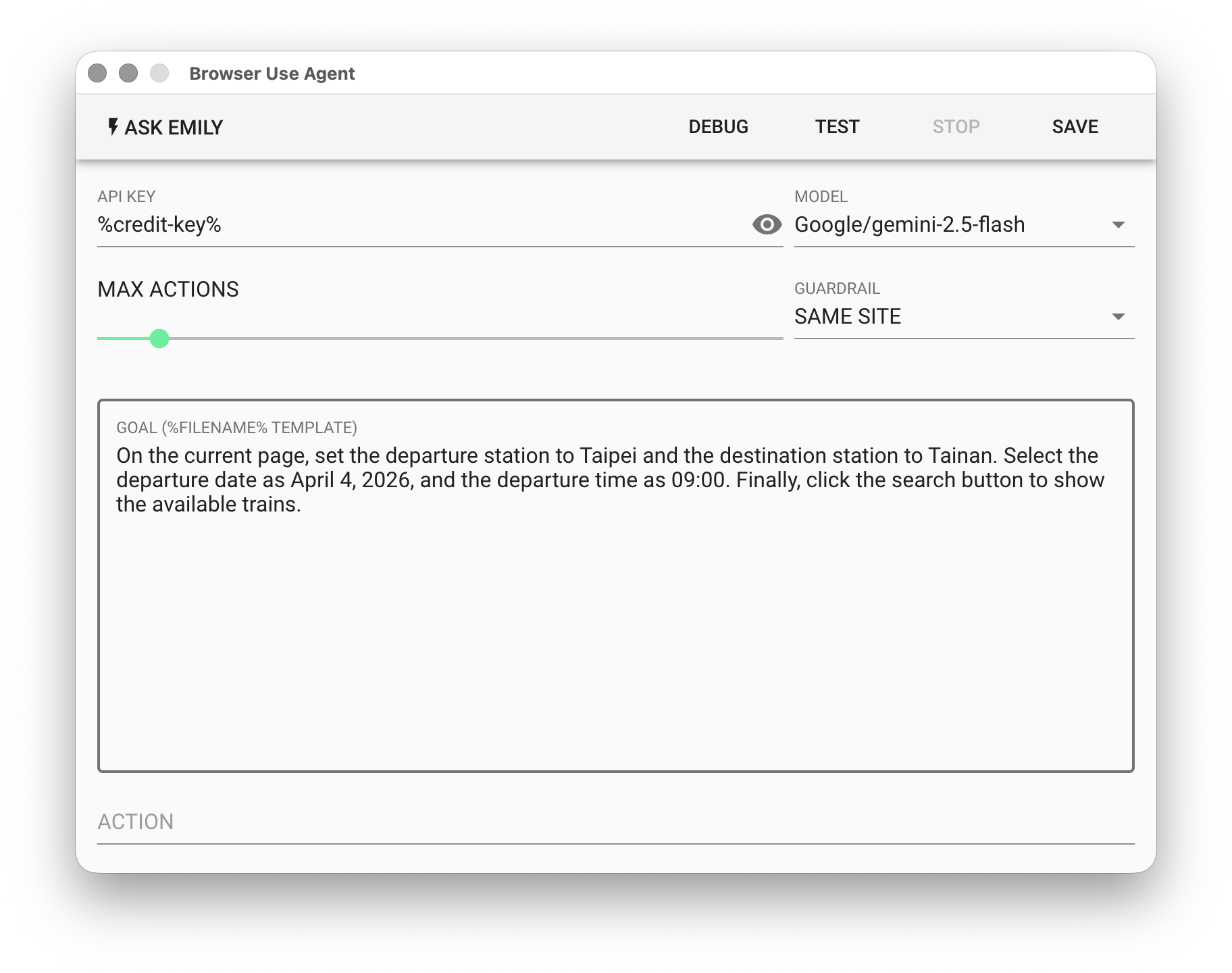 Browser Use Agent uses natural language to describe the task goal and autonomously operates the browser through a large language model (LLM). Note that larger goals make the language model more prone to misjudgment and consume more tokens — it is recommended to break tasks into smaller sub-tasks to reduce failure rates. If you're unfamiliar with how to prompt the language model to achieve task goals, use "Ask EMILY" to let the AI generate model-friendly goal prompts.