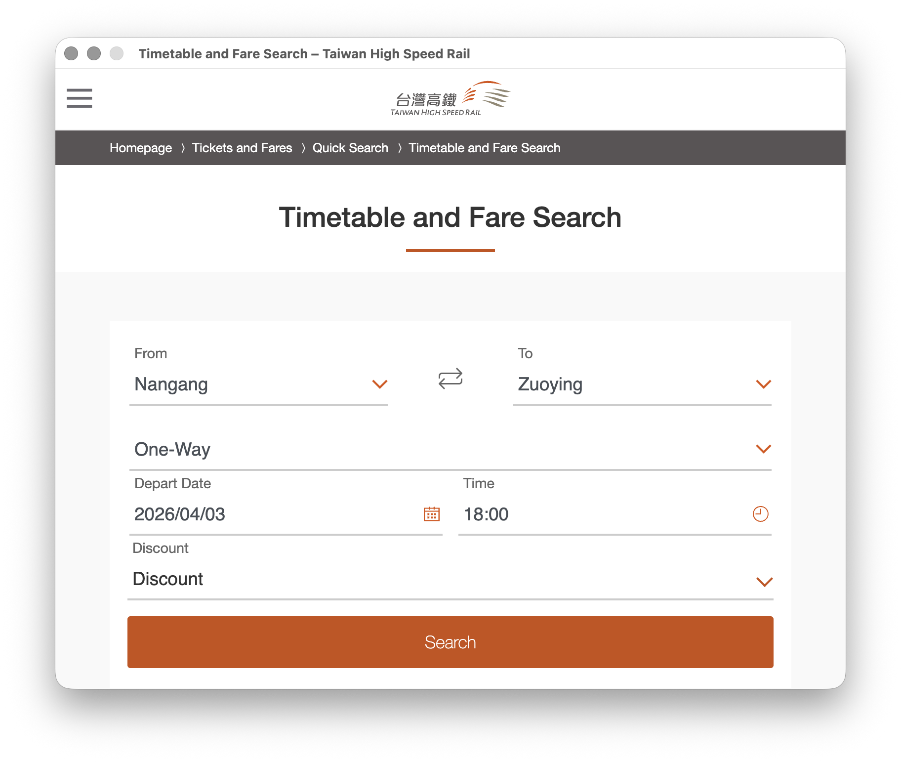 Using a high-speed rail schedule query as an example, the query page defaults to departing from "Nangang" to "Zuoying", with date 2026/04/03 and time 18:00.