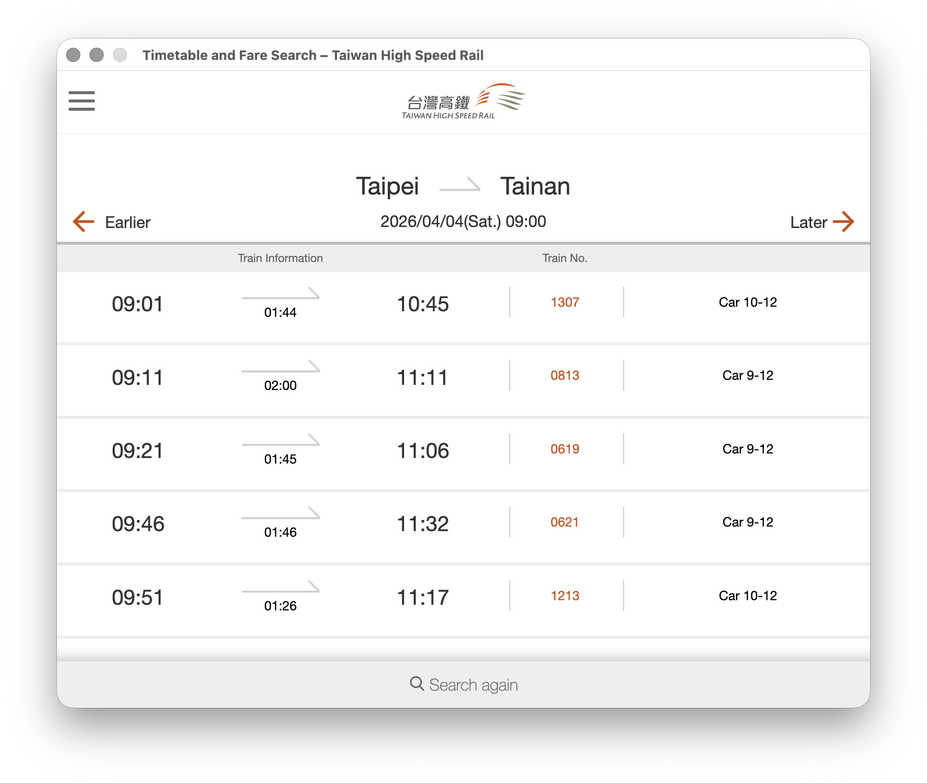 Use natural language to prompt the model: Query trains departing from "Taipei" to "Tainan" 9 AM on 2026/04/04. Then click "TEST" to execute.