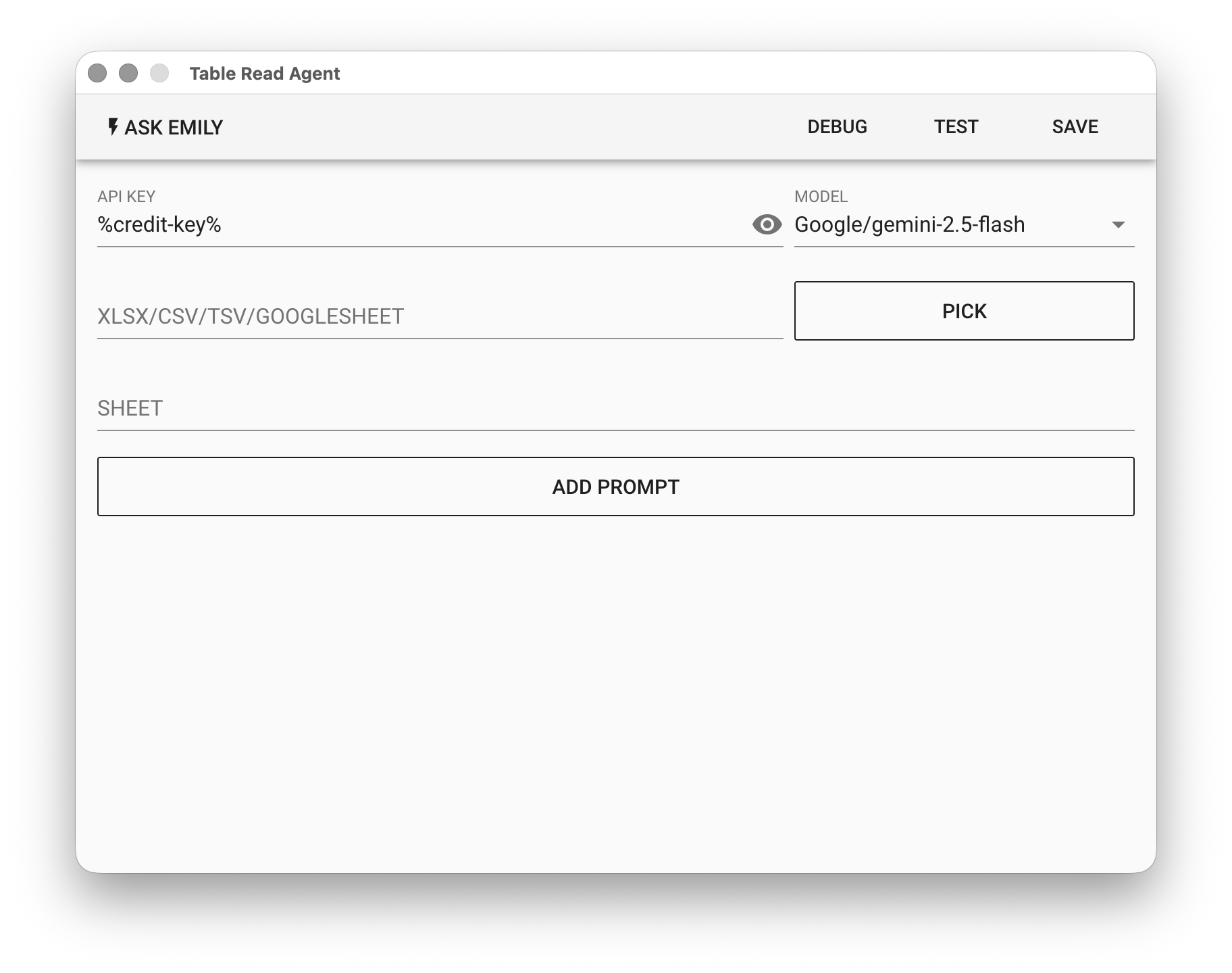Table Read Agent uses a large language model (LLM) to extract information from spreadsheets and outputs the results to files in the working folder. If you're unfamiliar with how to prompt the language model to achieve task goals, use "Ask EMILY" to let the AI generate model-friendly goal prompts.