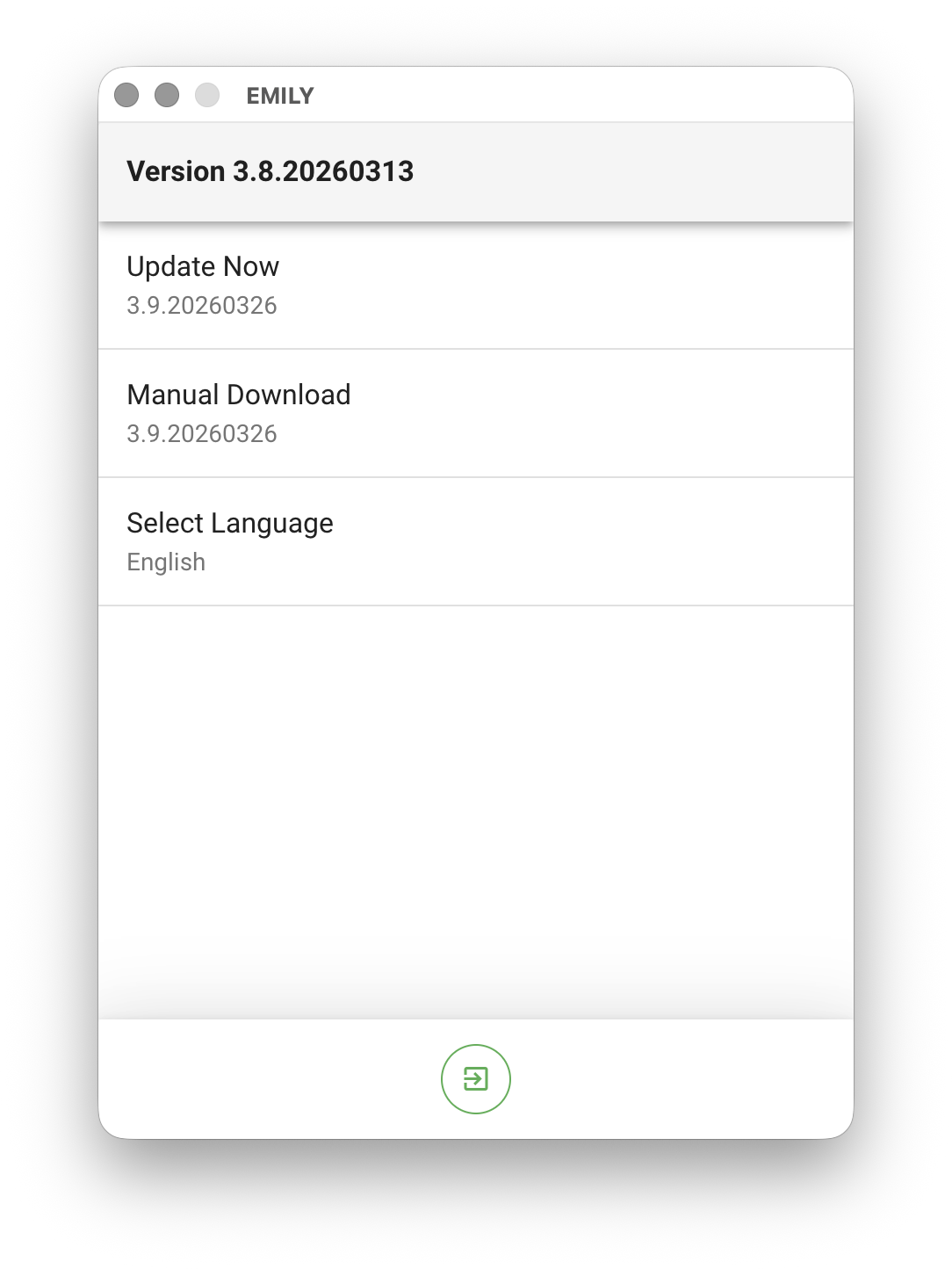 Clicking the version item opens the version details page. If an update is available, the page will show two options: "Update Now" and "Manual Download". If the automatic update fails, you can use manual download instead — this may happen because antivirus software or endpoint protection software blocks the download of executable installation files. When downloading manually, make sure your firewall allows connections to the domain cdn.emily-rpa.com.
