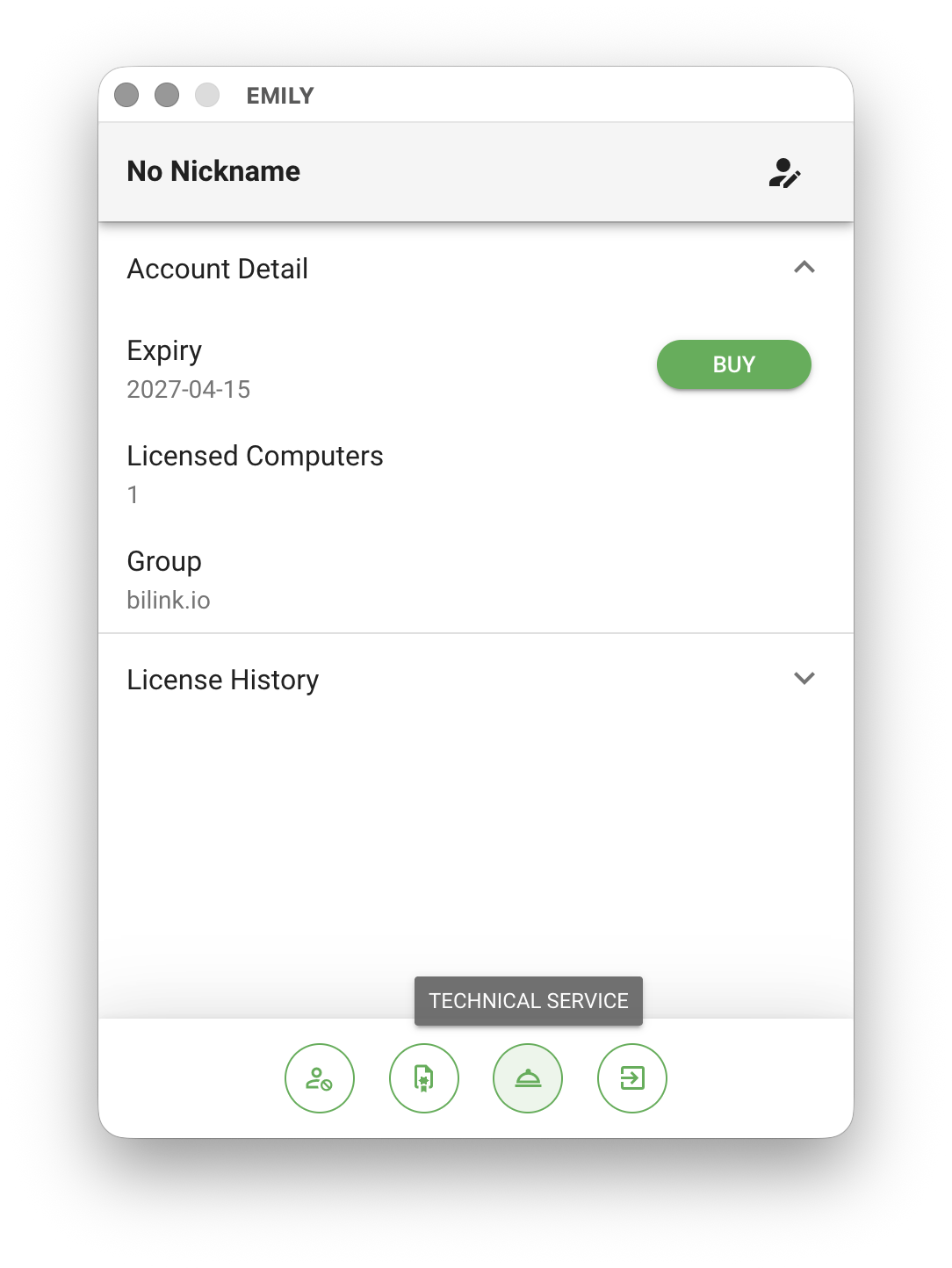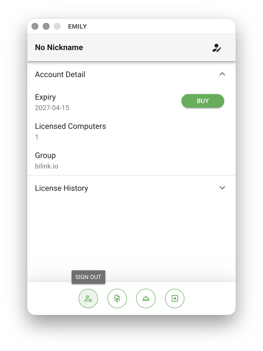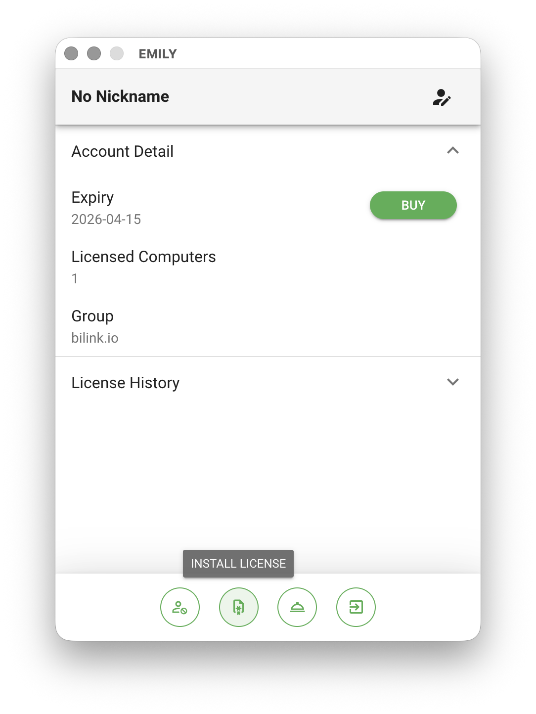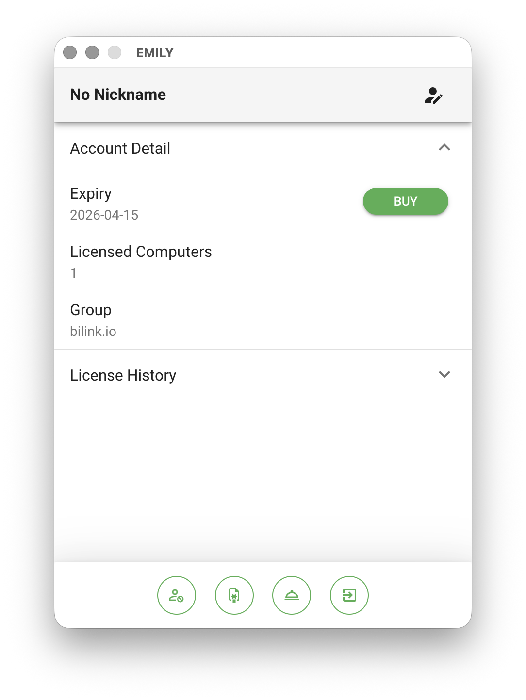 Clicking the account item opens the account details page, which includes "Expiration Date", "Licensed Computers", "Group", and "License History". Licensed Computers and Group require an enterprise plan to configure. The default number of licensed computers is one, meaning EMILY.RPA can only be open on one computer at a time. The Group feature provides skill sharing and permission management across multiple accounts in an enterprise — contact your sales representative for details.