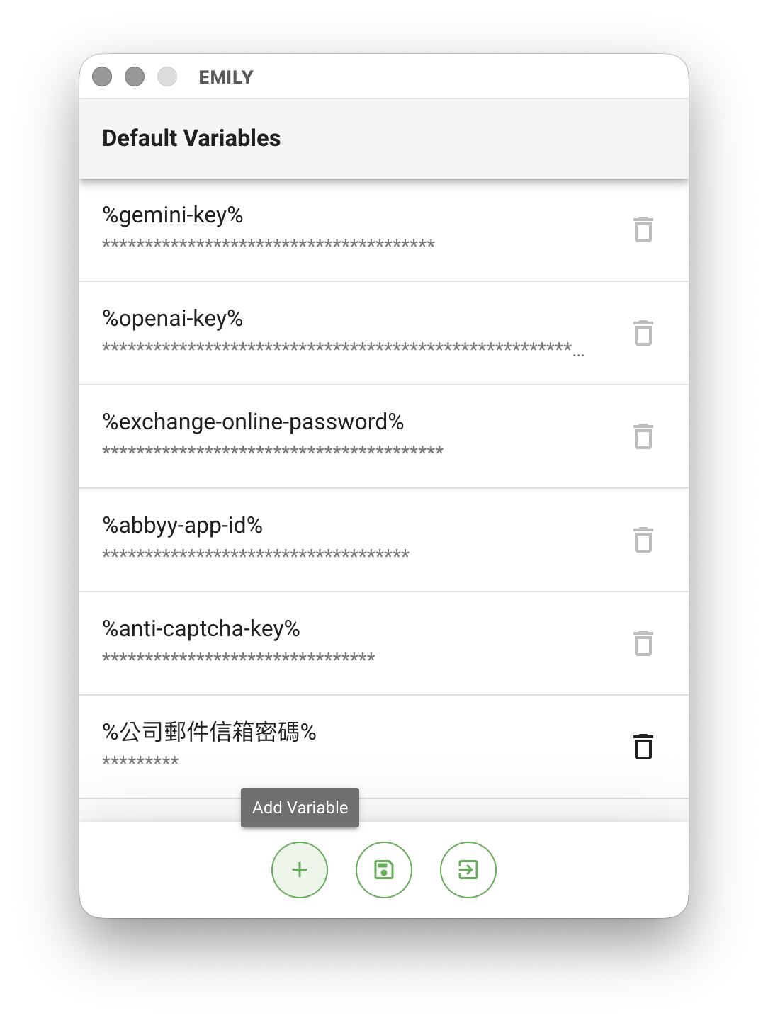 "Default Variables" allows you to save commonly used input information as variables, which can be used for accounts, passwords, or keys across various automated systems. The enterprise plan additionally provides group-shared variables that can be used by accounts within the group without exposing plaintext values.