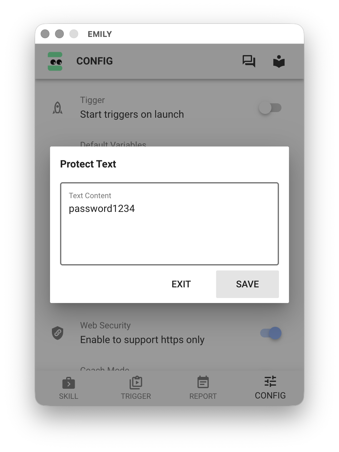 In the "Protect Text" dialog, you can enter sensitive text data such as passwords. EMILY.RPA encrypts it using an OS-protected key and saves it as ciphertext. This ciphertext file is only decrypted in real time when used within a skill — plaintext is never stored.