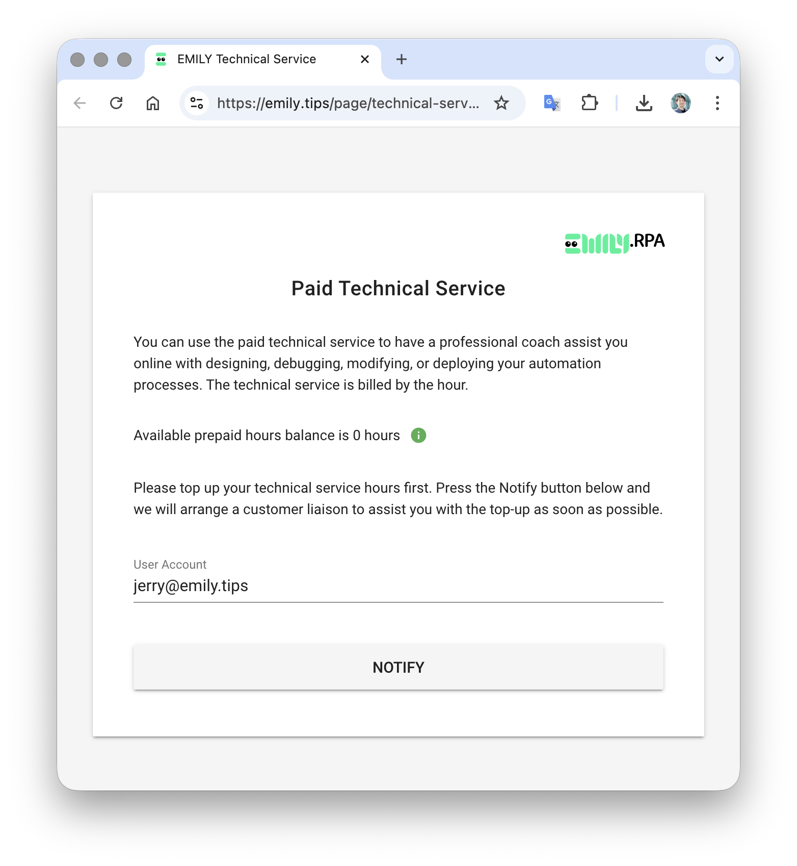 EMILY.RPA's account authorization, version updates, and other settings are all found on the "Account Settings" page. Available updates (if any), version number, account name, and license expiration date can be found directly on the page.