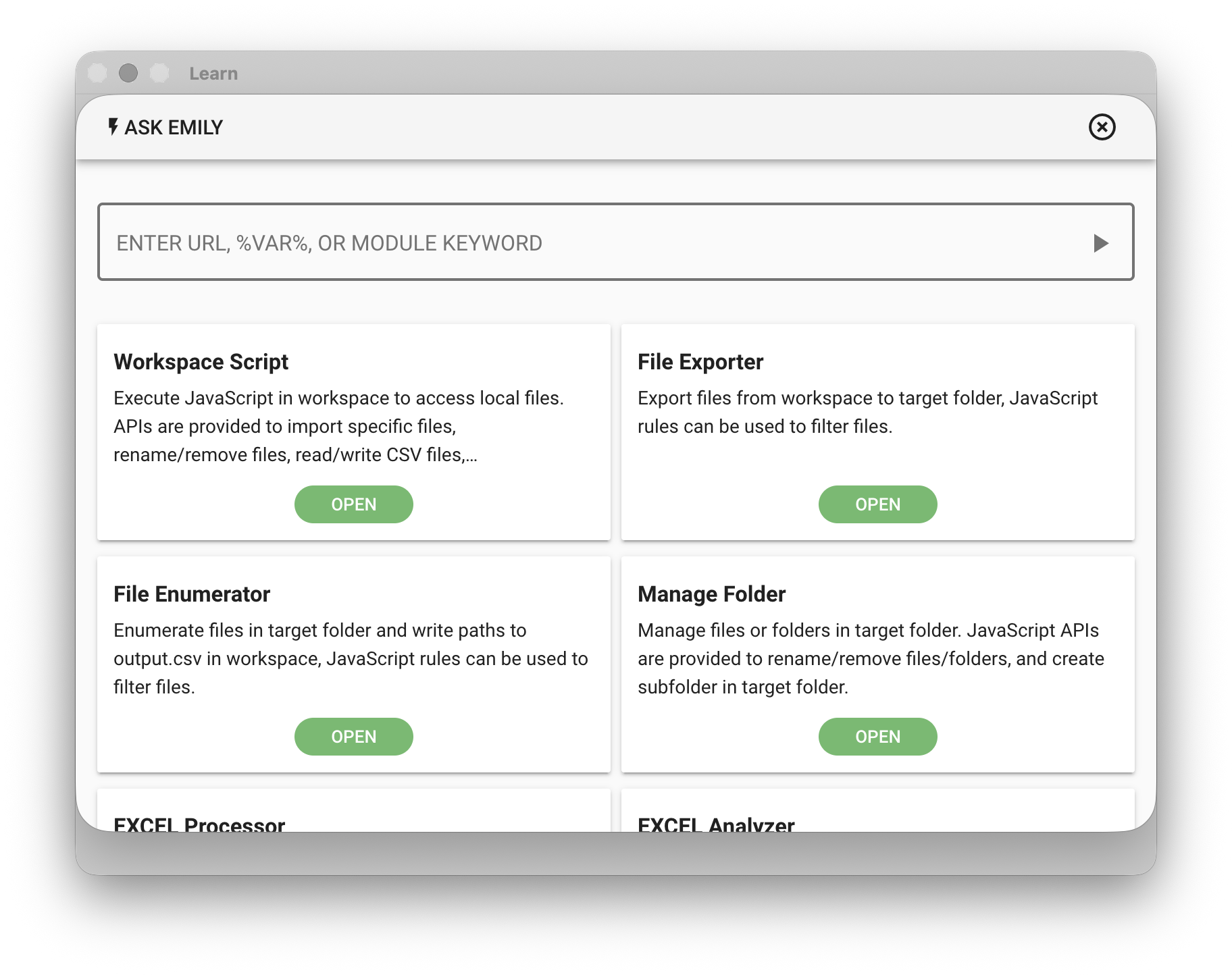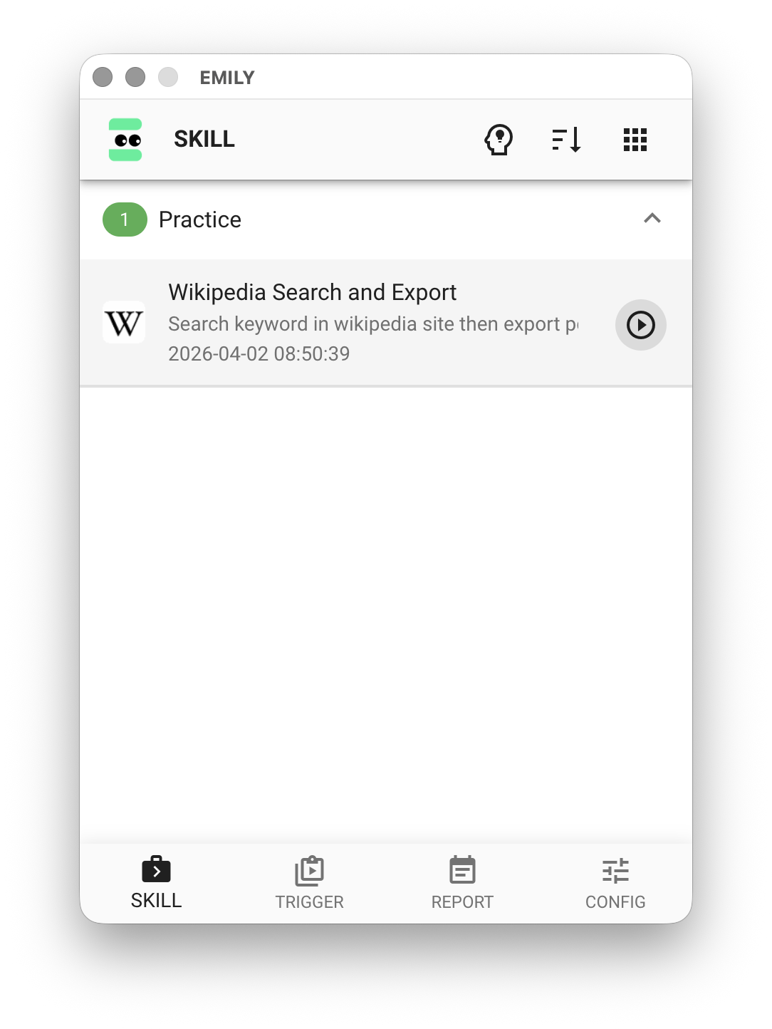Congratulations! You've just completed your first EMILY.RPA automation skill. The skill you uploaded will now appear on the "My Skills" page. Click the play button on the right side of the skill to execute it.