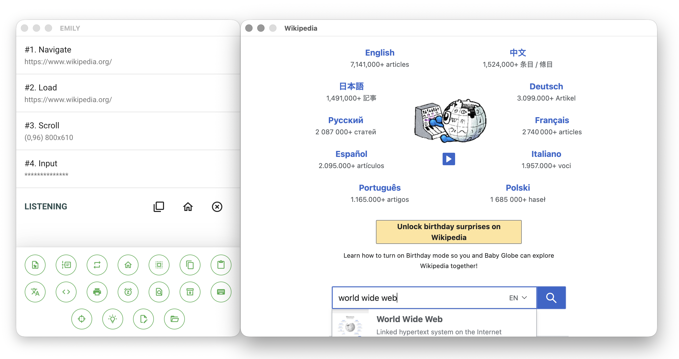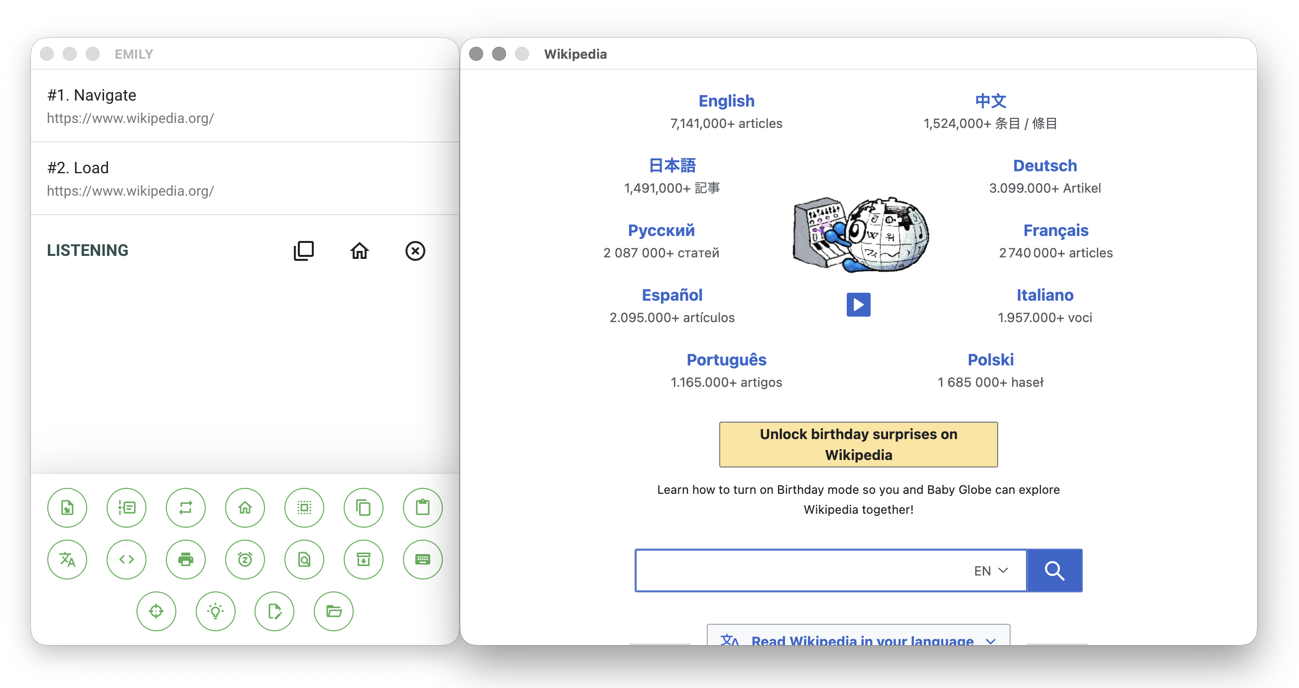 At this point, you should see the screen shown below. The upper half of the main window on the left displays the command list, the lower half shows various tool icons, and the browser window displays the Wikipedia homepage.