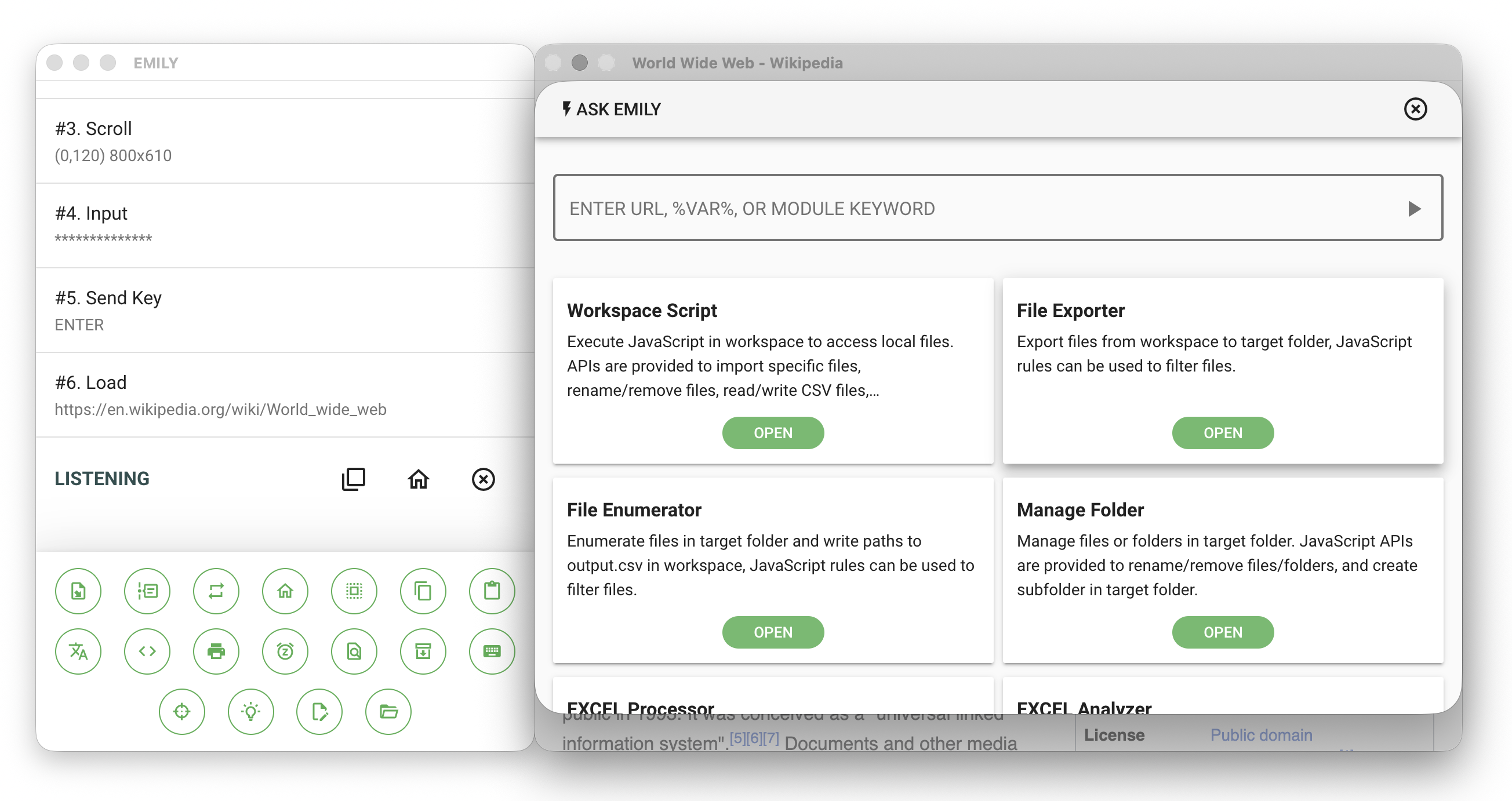 Now let's design a simple skill hands-on. First, we'll go to the Wikipedia website at https://www.wikipedia.org/ to search for the keyword world wide web, then save the search results as a PDF file, and finally place it on the desktop. This skill will use web automation to operate the EMILY.RPA browser, as well as an automation module to copy the file to the desktop. Through this exercise, you'll quickly understand how the design mode works.
