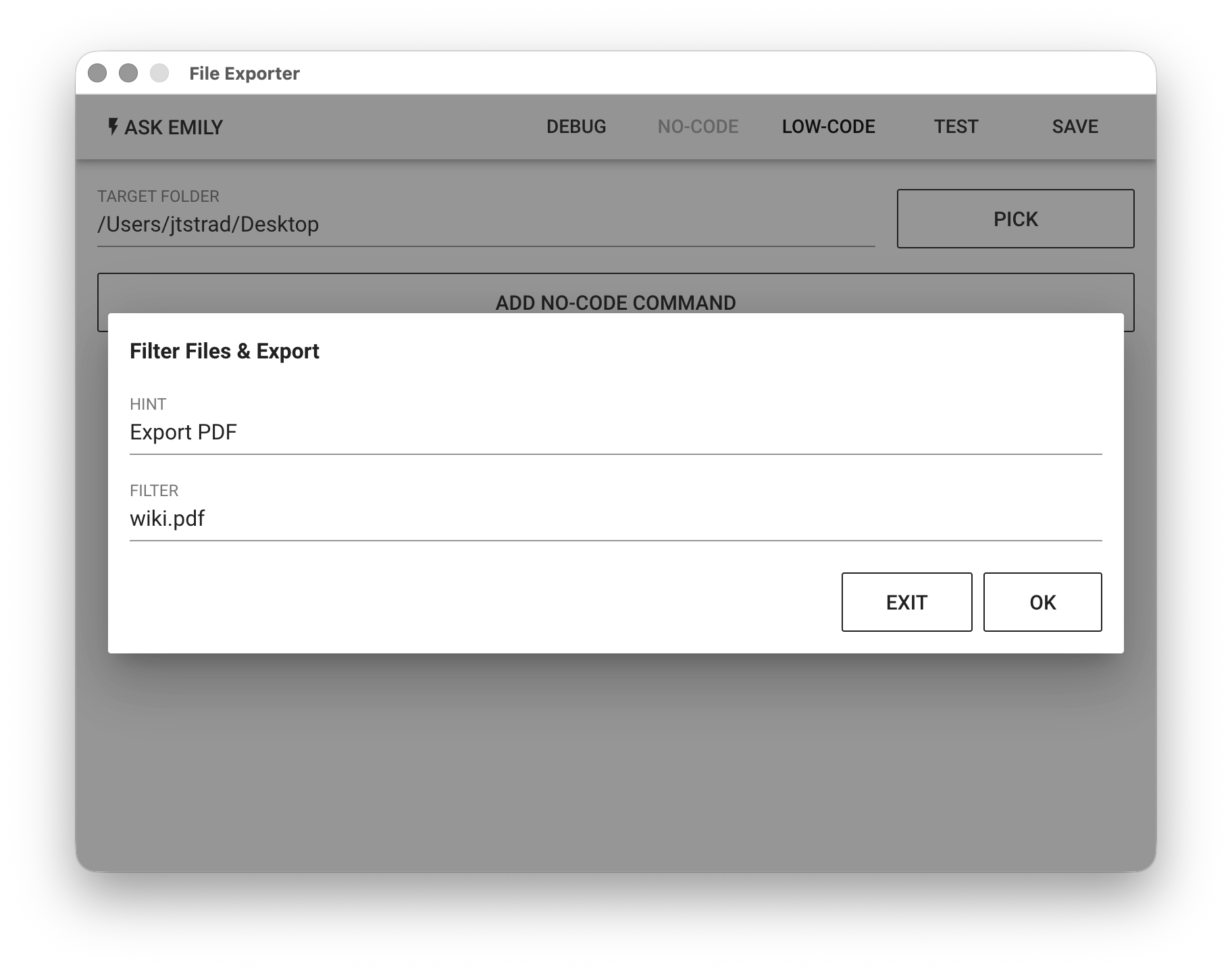 In the "Export Working Folder" module interface, first click the "PICK" button and select the Desktop folder as the export destination. Then click "ADD NO-CODE COMMAND" and choose the "Filter Files then Export" command. In the HINT field, enter something descriptive like Export output PDF. In the FILTER field below, enter wiki.pdf, then click "OK".