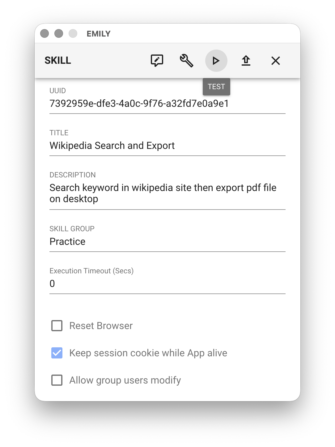 The final step is to fill in the Name and Description fields for the recorded skill. Although these are not required, they are very helpful for future management and further applications, so we recommend filling them in carefully. In the header area of the interface, you can click "Test" — EMILY.RPA will execute each recorded command step by step to confirm the workflow achieves its goal. Then click the "Upload" button next to Test to upload and back up the skill to the cloud Skill Hub, which also saves it locally.