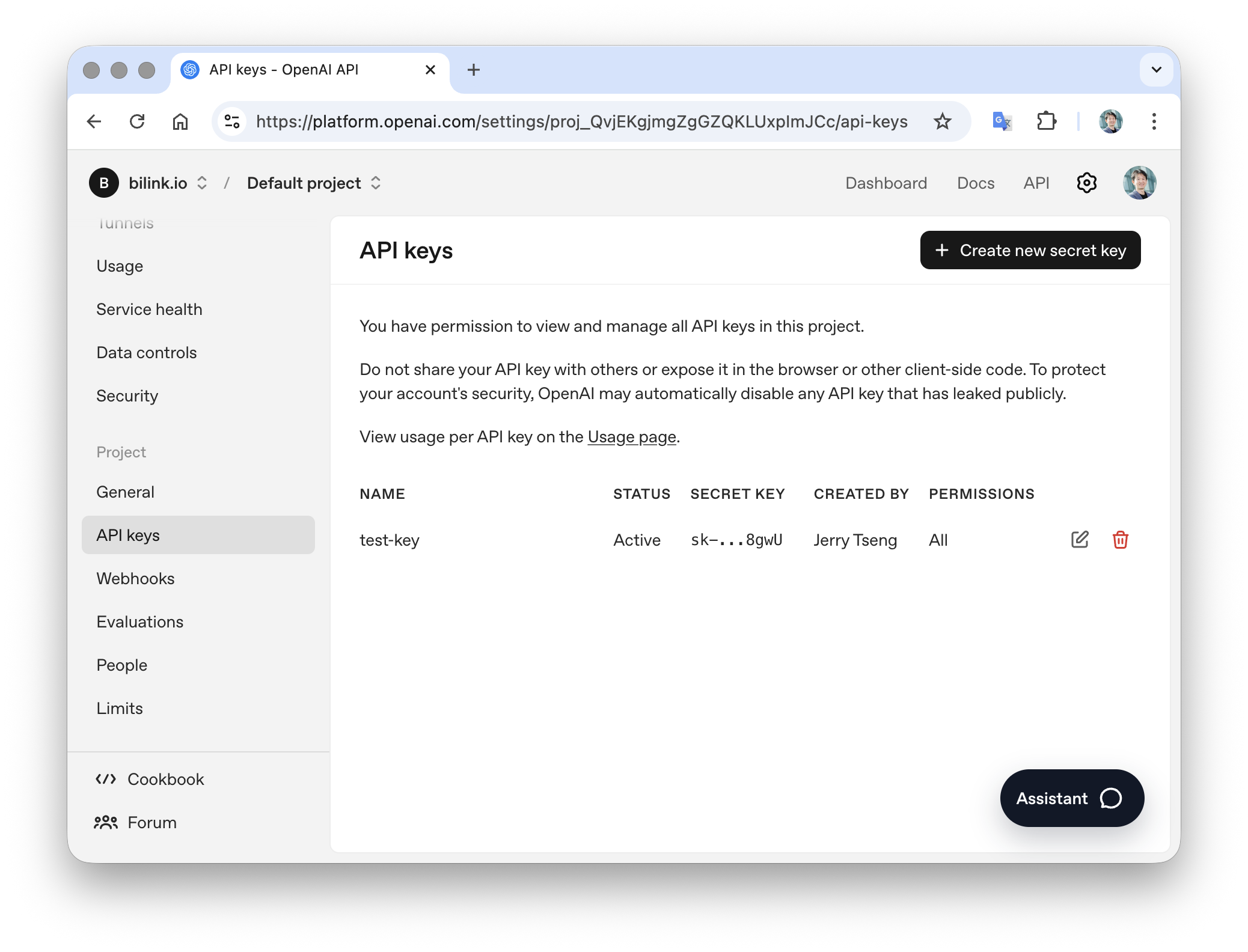 Then select "API keys" in the left sidebar to enter the page and generate a key. Copy it to the clipboard and you're done.