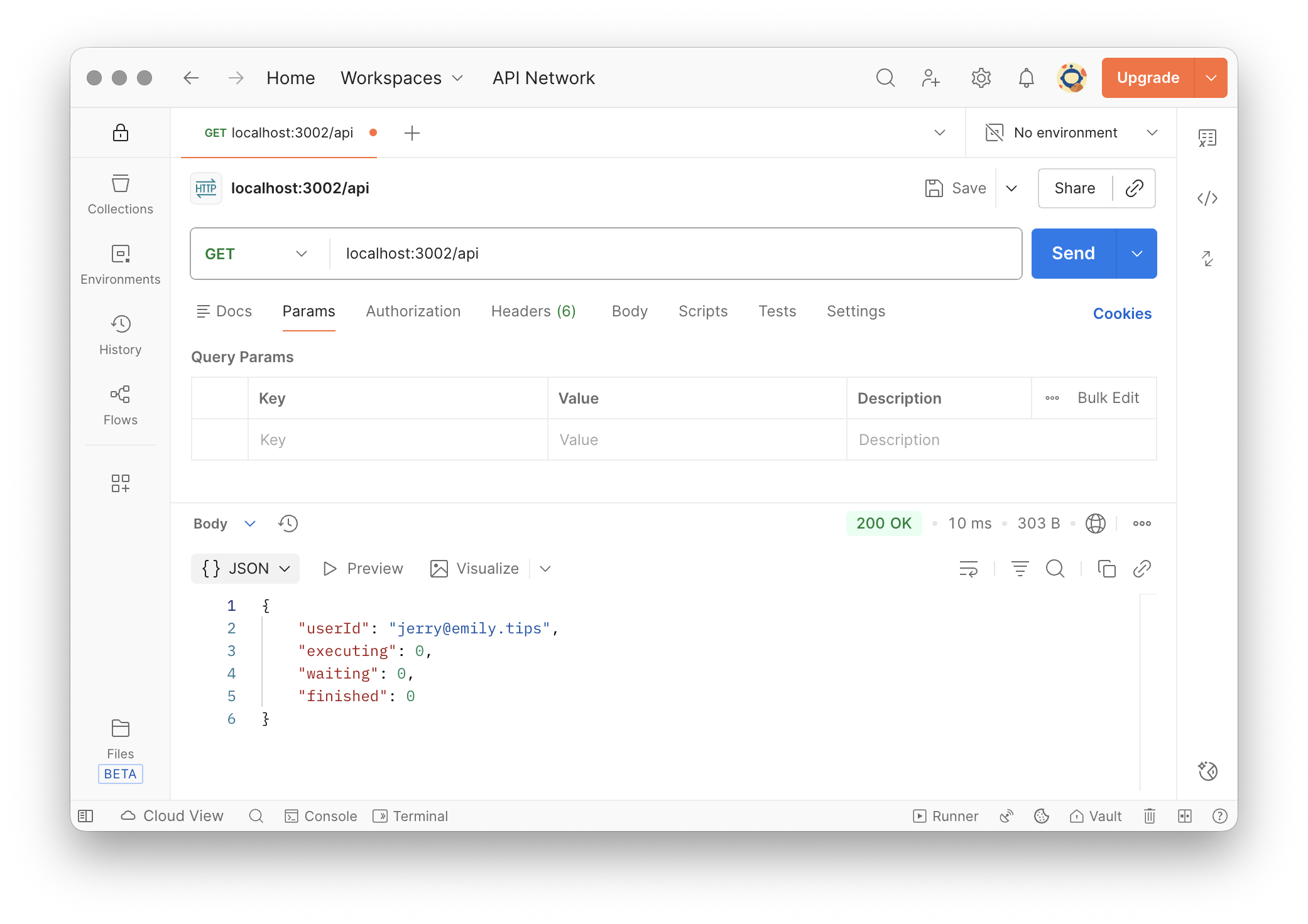 After configuration, you need to start fully automated mode for the API server to begin running. The port number you configured combined with the IP address of the computer running EMILY.RPA forms the endpoint URL. You can use an API testing tool like Postman to test the API trigger. First, send a GET http://localhost:3002/api request using the port you configured to verify the API server is running properly. If successful, you should see a response similar to the image below, including the user account userId, whether a triggered job is currently executing executing, how many jobs are waiting waiting, and how many jobs are finished finished.