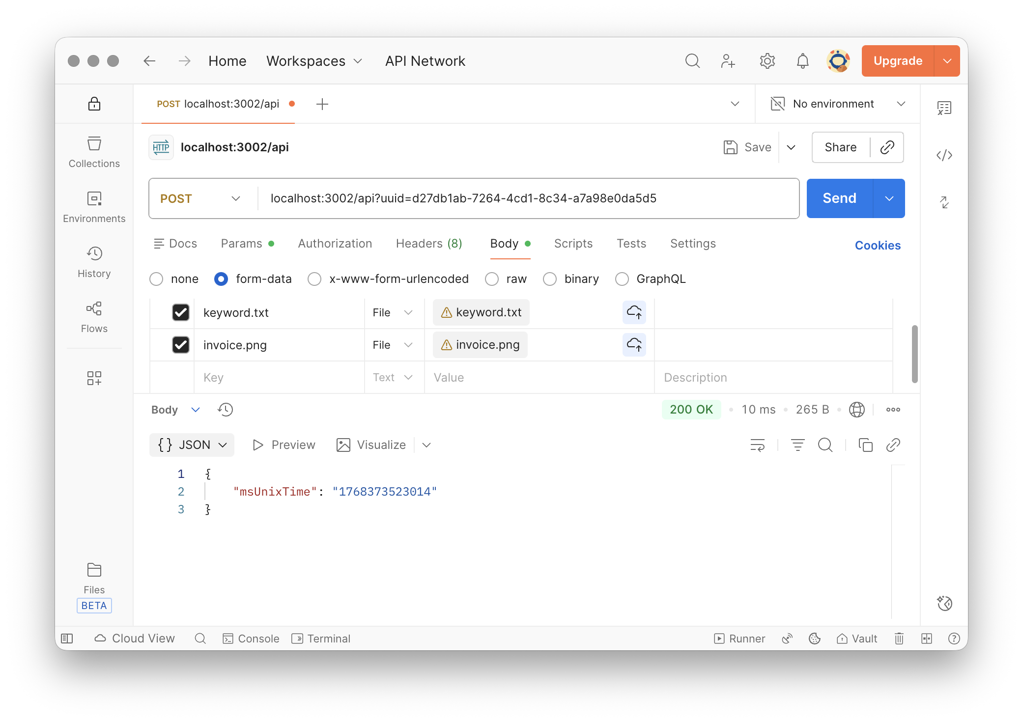 The uuid parameter in the endpoint URL is the identifier of the automation skill to execute. For example: GET http://ip-address:port/api?uuid=1a2b requests EMILY.RPA to execute the automation skill with identifier 1a2b. If you want to upload files as input for the automation skill, use POST http://ip-address:port/api?uuid=1a2b and upload the input files as multipart/form-data. The image below shows an example using Postman, sending a request to execute the skill "Search Wikipedia and Export File" while uploading keyword.txt and invoice.png to the skill's working folder. The server responds with a job queue number msUnixTime that can be used as a parameter for subsequent status queries.