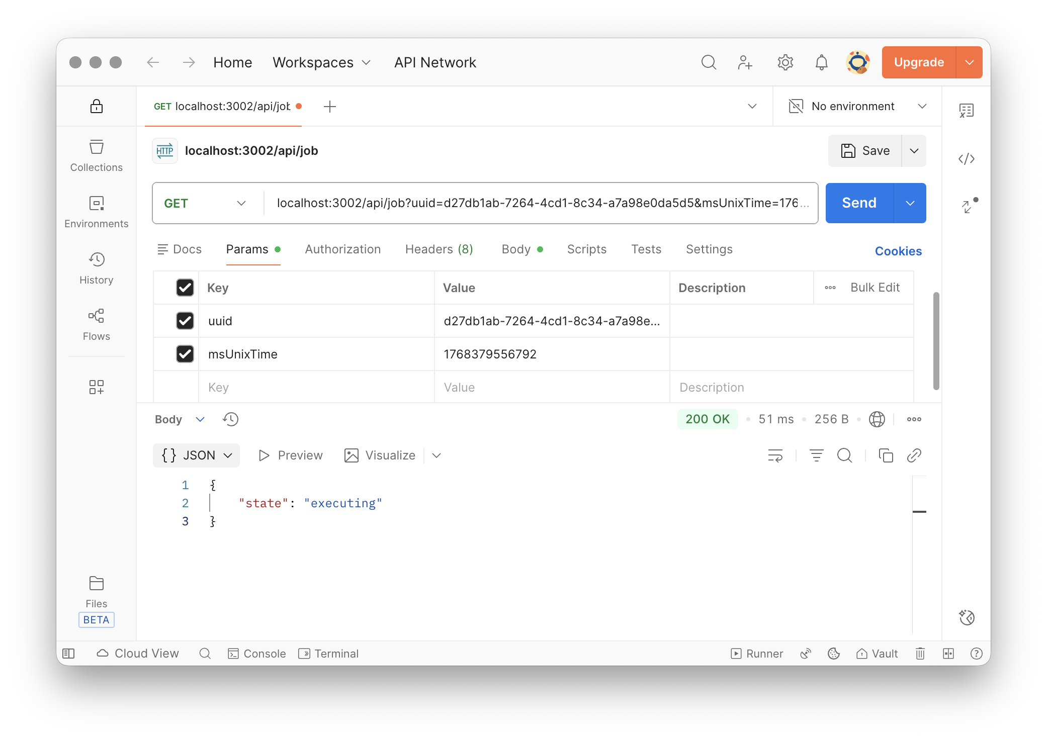 In addition to using GET http://ip-address:port/api to query the overall job queue status, you can also use the msUnixTime job queue number returned by the server to query the status of a specific triggered skill. Send a request GET http://ip-address:port/api/job?uuid=1a2b&msUnixTime=1234 to get the current status of that job. Possible statuses include inqueue / executing / finished: