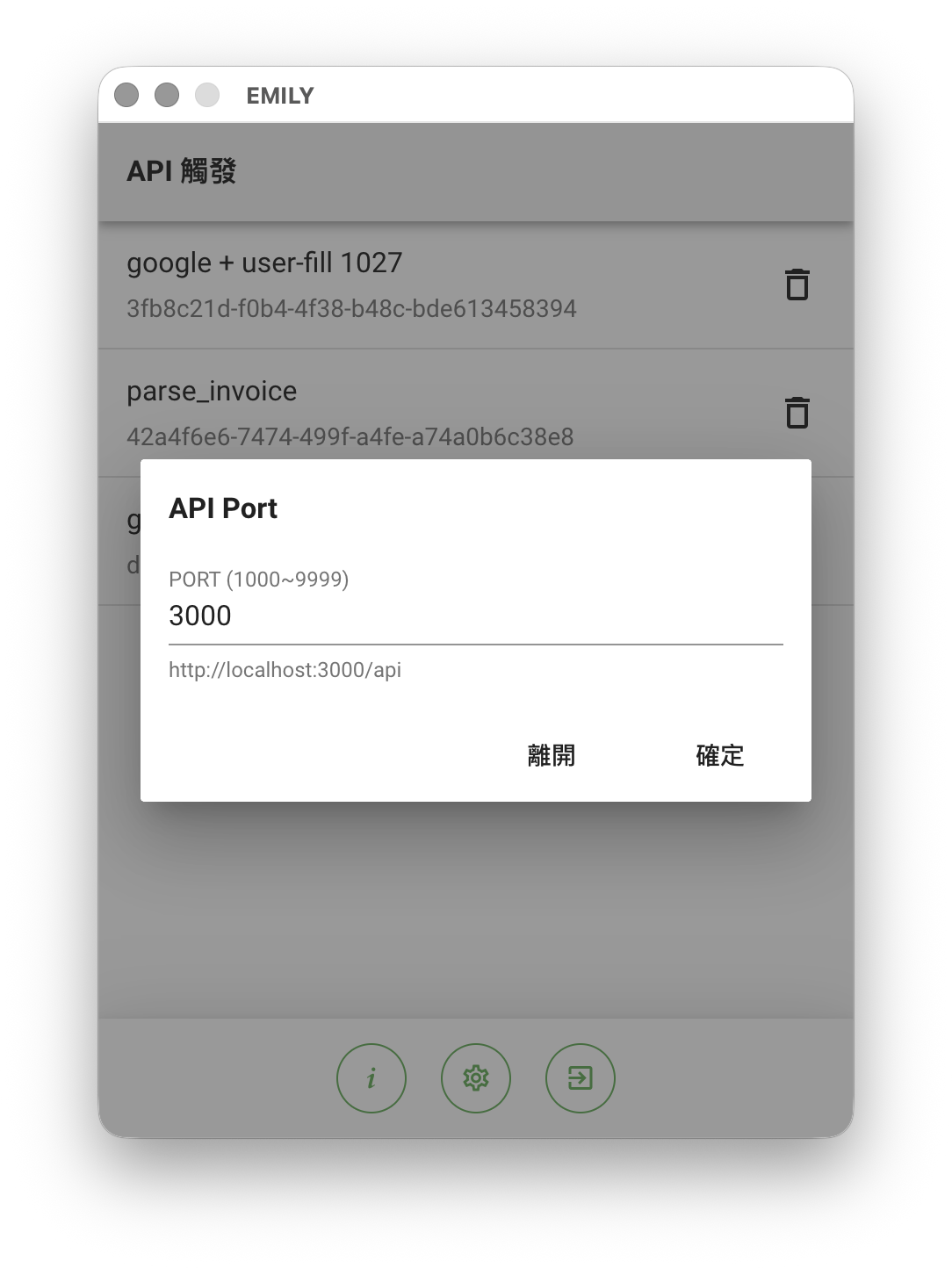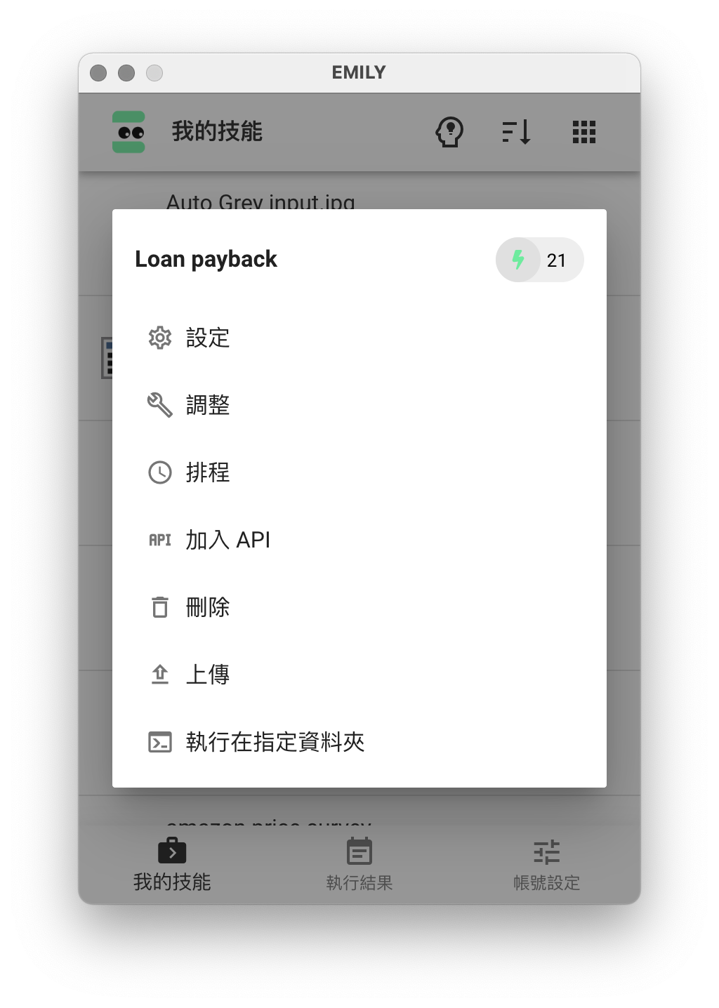 點擊任一技能後彈出選單中,選擇 加入 API 即可將這個技能開放給其它於同個網段的裝置以 API 請求 EMILY 執行。