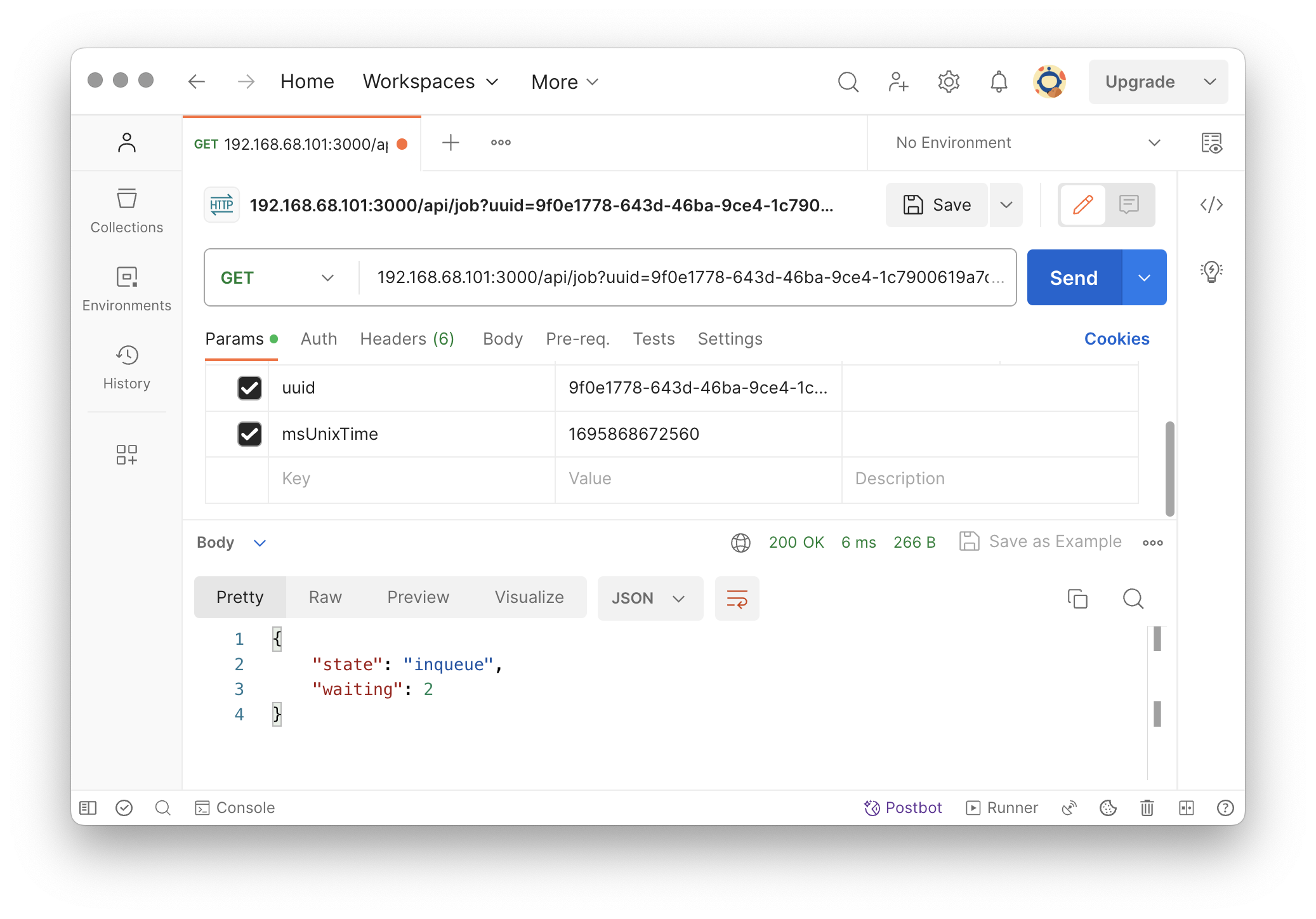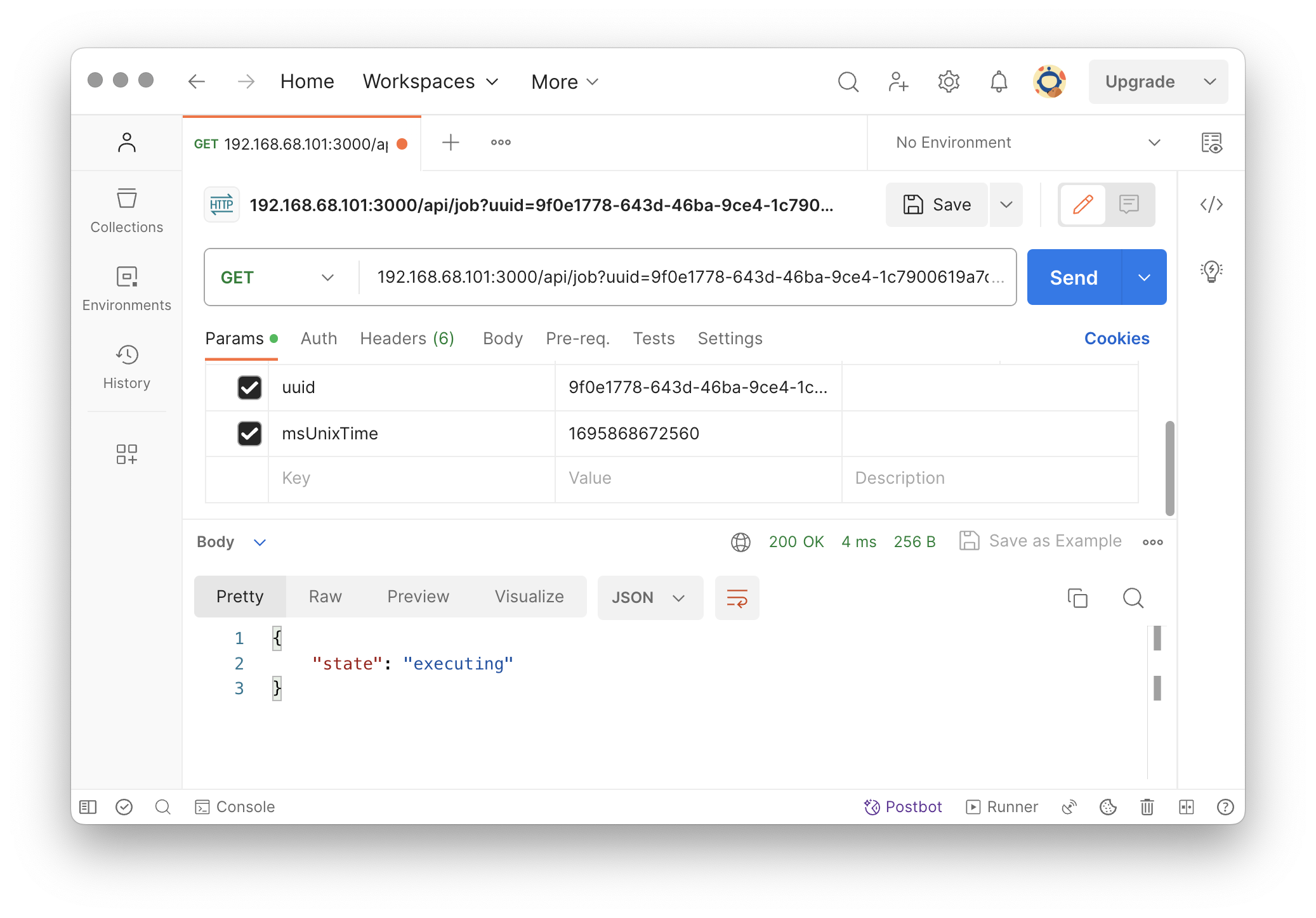 當使用 API 觸發一個技能後會返回一個 JSON 物件 { msUnixTime: "1656215466302" },代表已經將指定技能排入工作序列, caller 端可以利用 GET /api/job?uuid=1a2b\&msUnixTime=1234 來得到這個工作的目前狀態,狀態包括 inqueue / executing / finished: