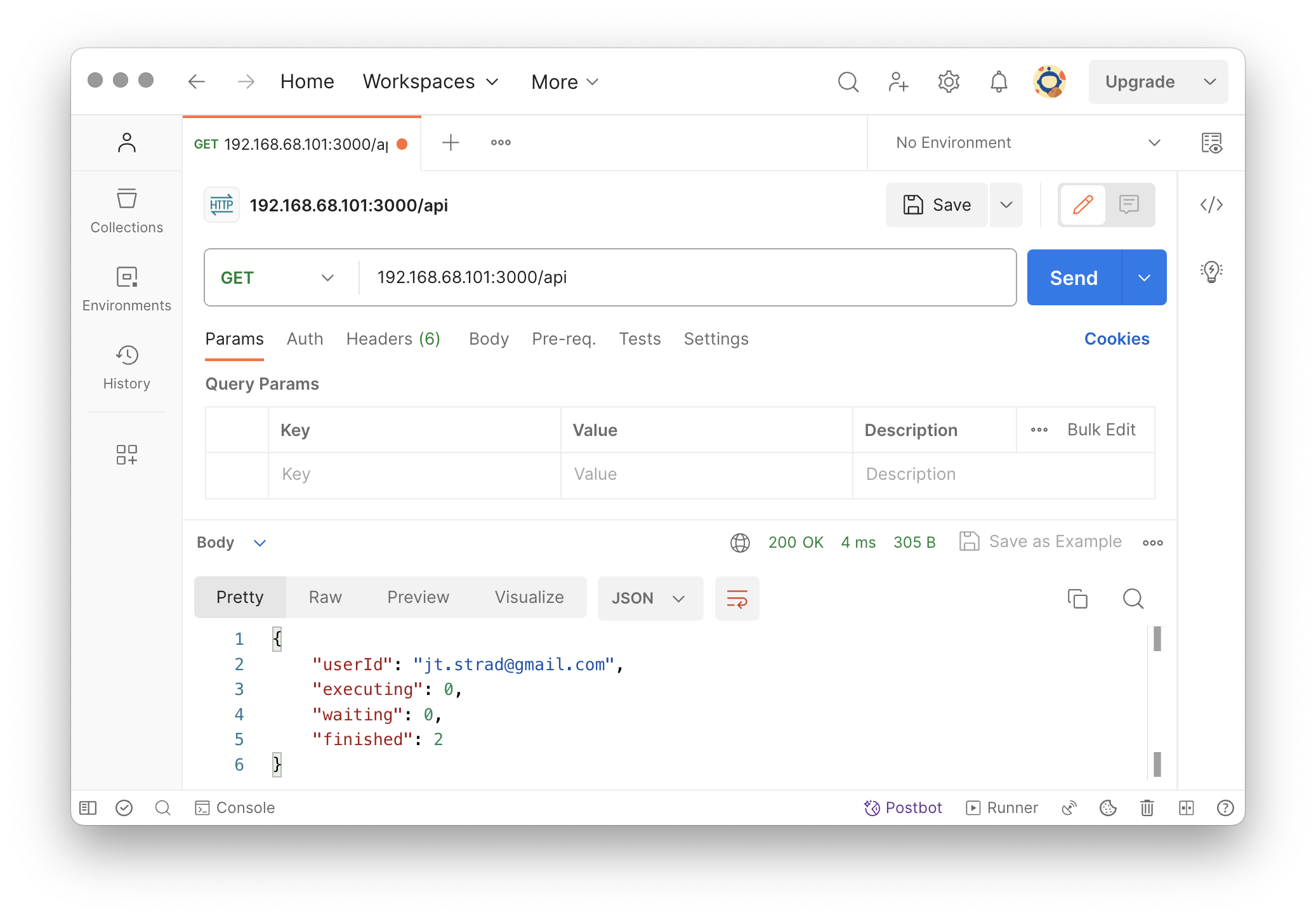 想要取得 EMILY 的整體工作狀態可以使用 GET /api 無須帶任何參數,工作狀態會包含:是否正在執行 executing / 等待序列長度 waiting / 已完成工作數量 finished: