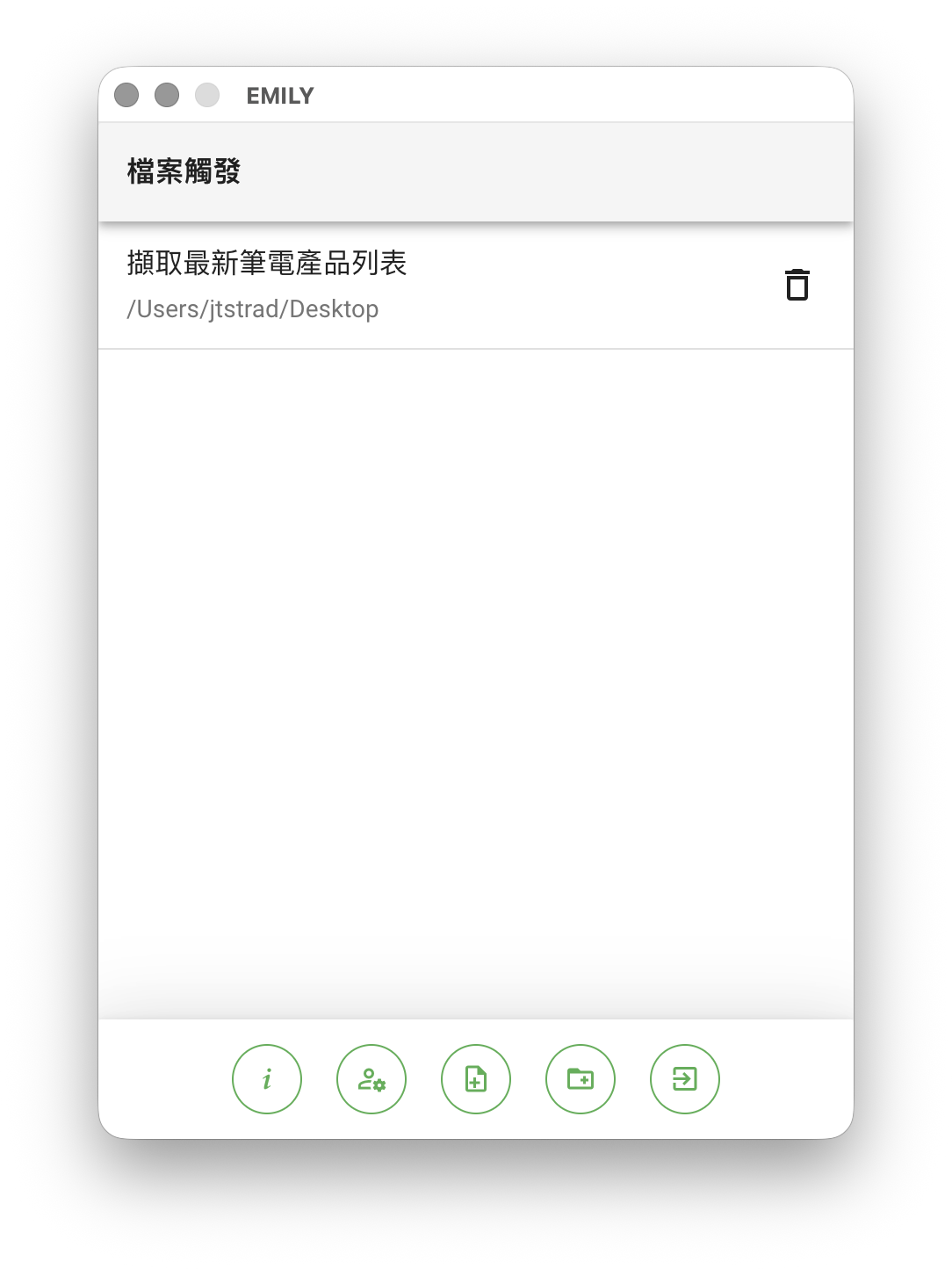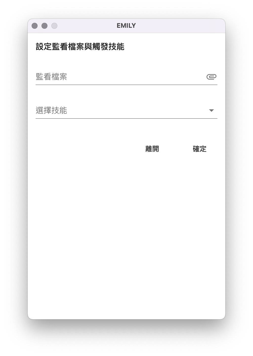 點擊新增檔案觸發按鈕,點擊監看檔案右側的迴紋針圖示開始選取想監看的檔案,並在下方選擇技能選單中選取檔案被改變時觸發的技能。監看檔案被寫入新資料、刪除、改變檔案名稱都會造成觸發,其中寫入資料時會自動延遲 6 秒啟動觸發,目的是讓短資料可以在大多數的情況下被完整寫入,以提供執行技能有完整的檔案資料。在寫入資料是無法預期結束時間的情況下,建議技能內必須自行設計檢查機制。