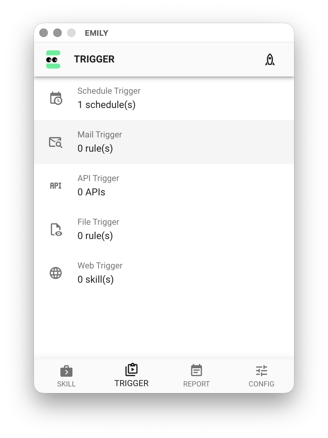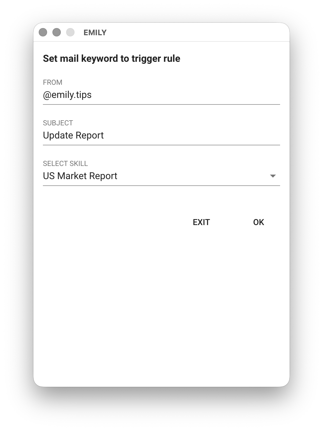 An email trigger rule consists of two field conditions: FROM and SUBJECT — both must be satisfied simultaneously to trigger skill execution. If you want to ignore a field condition, simply leave that field empty. For example, if you want any email from info@emily.tips to trigger the skill, just enter info@emily.tips in the FROM field and leave the SUBJECT field empty.