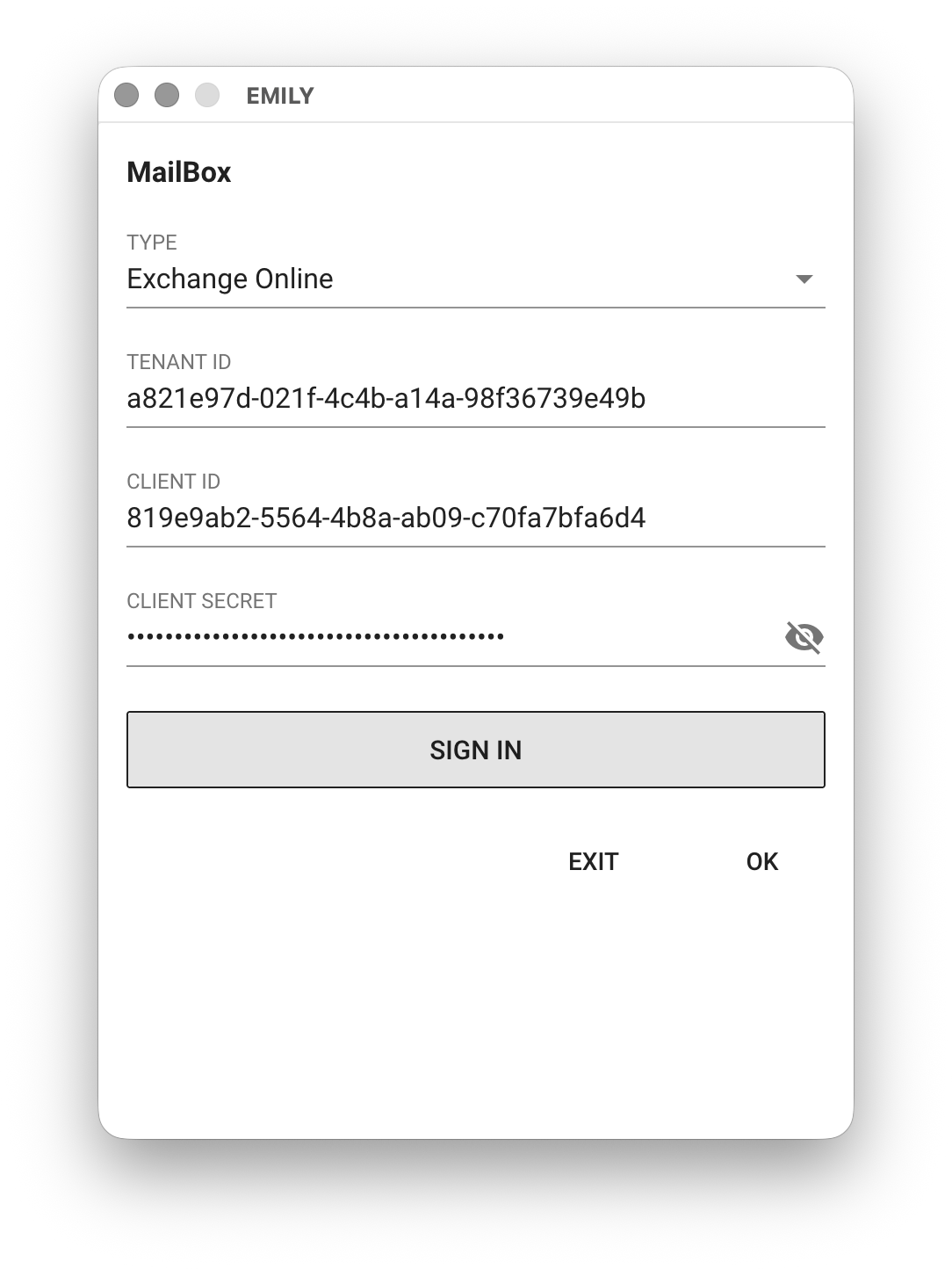 If using Exchange Online mail service, select Exchange Online for TYPE, fill in the other fields, and click "SIGN IN" to log in with the mailbox user's Microsoft account and authorize. After successful authorization, the SIGN IN button text will change to the account name. For the required information, refer to Exchange Online Access Configuration.