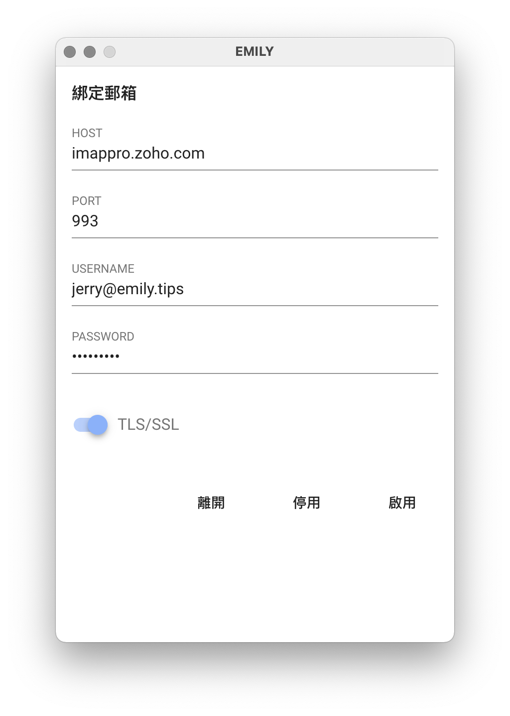 填入連線的電子郵箱 IMAP 郵件伺服器相關參數,畫面如下: