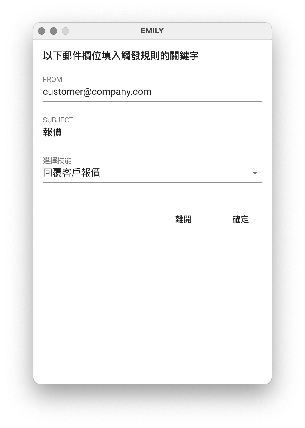 郵件觸發規則由 FROM 與 SUBJECT 兩個欄位條件組成,必須同時滿足才會觸發技能執行。如果希望忽略某一欄位條件的檢查,則只需要將該欄位清空。例如:只要是 info@emily.tips 寄來的郵件都觸發技能執行,那麼只需要在 FROM 欄位填入info@emily.tipsSUBJECT 欄位留空就可以了。