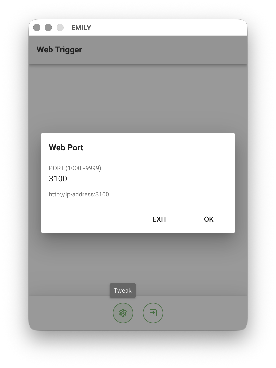 Click the "Adjust Parameters" icon at the bottom of the interface to open the "Web Port" dialog. The web server defaults to port 3100. If it conflicts with another server, you can change it — for example, to 3102 — then click "OK".