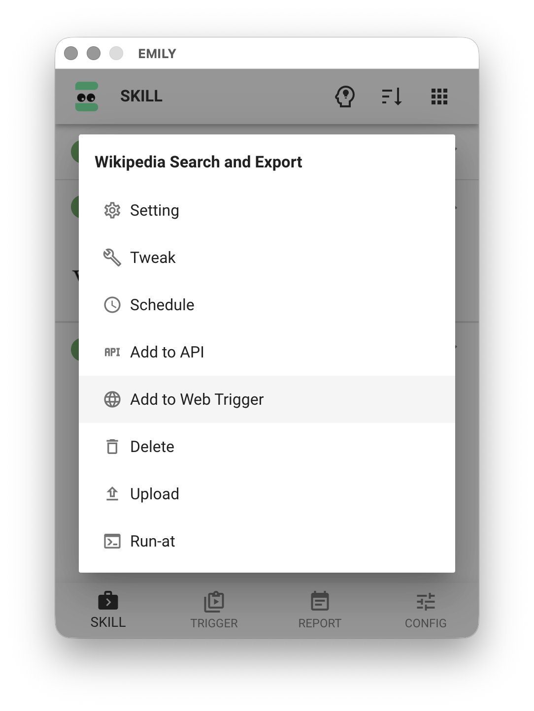 On the "My Skills" page, click the skill you want to trigger to open the menu, then select the "Add to Web Trigger" option to add the skill to the web service.