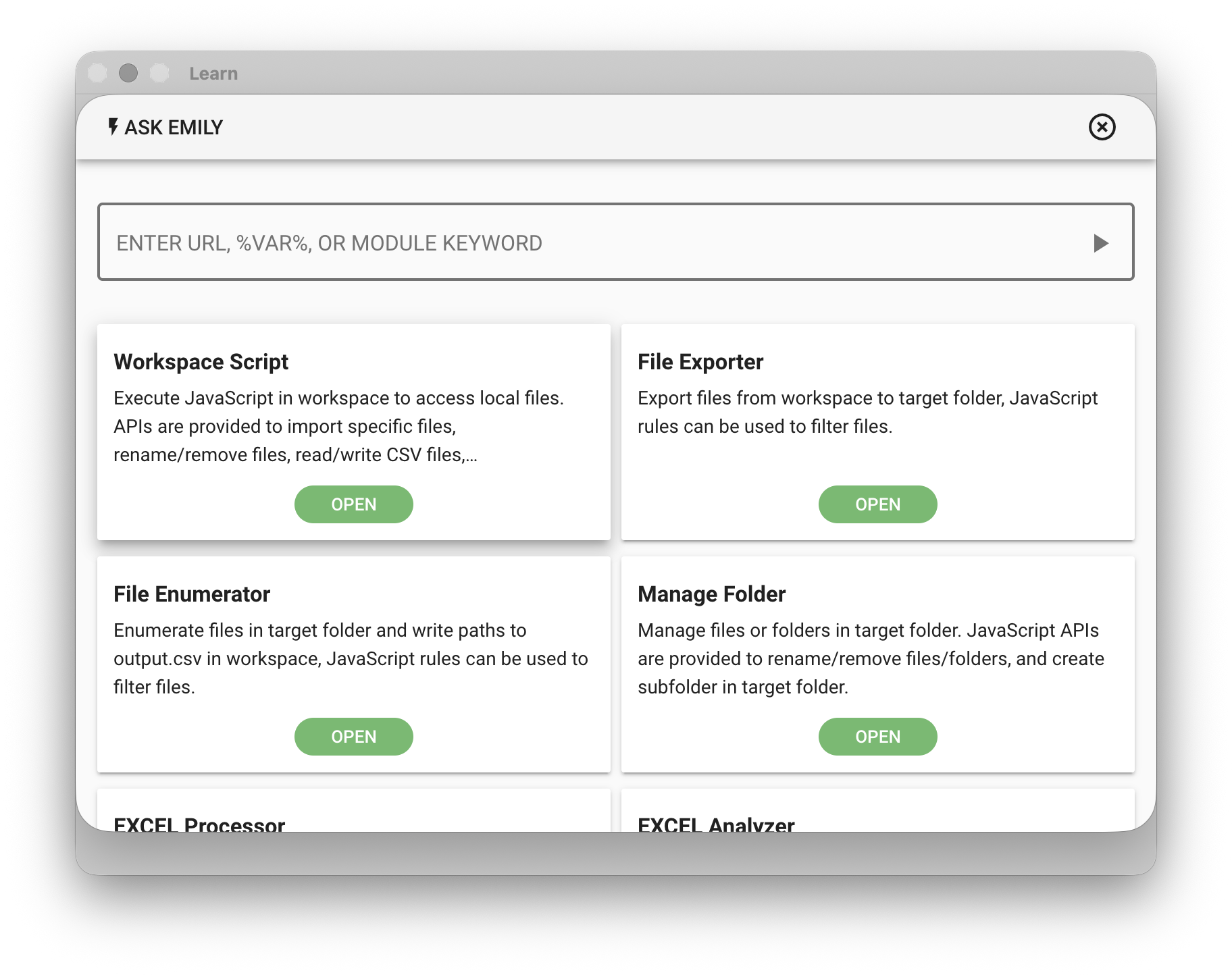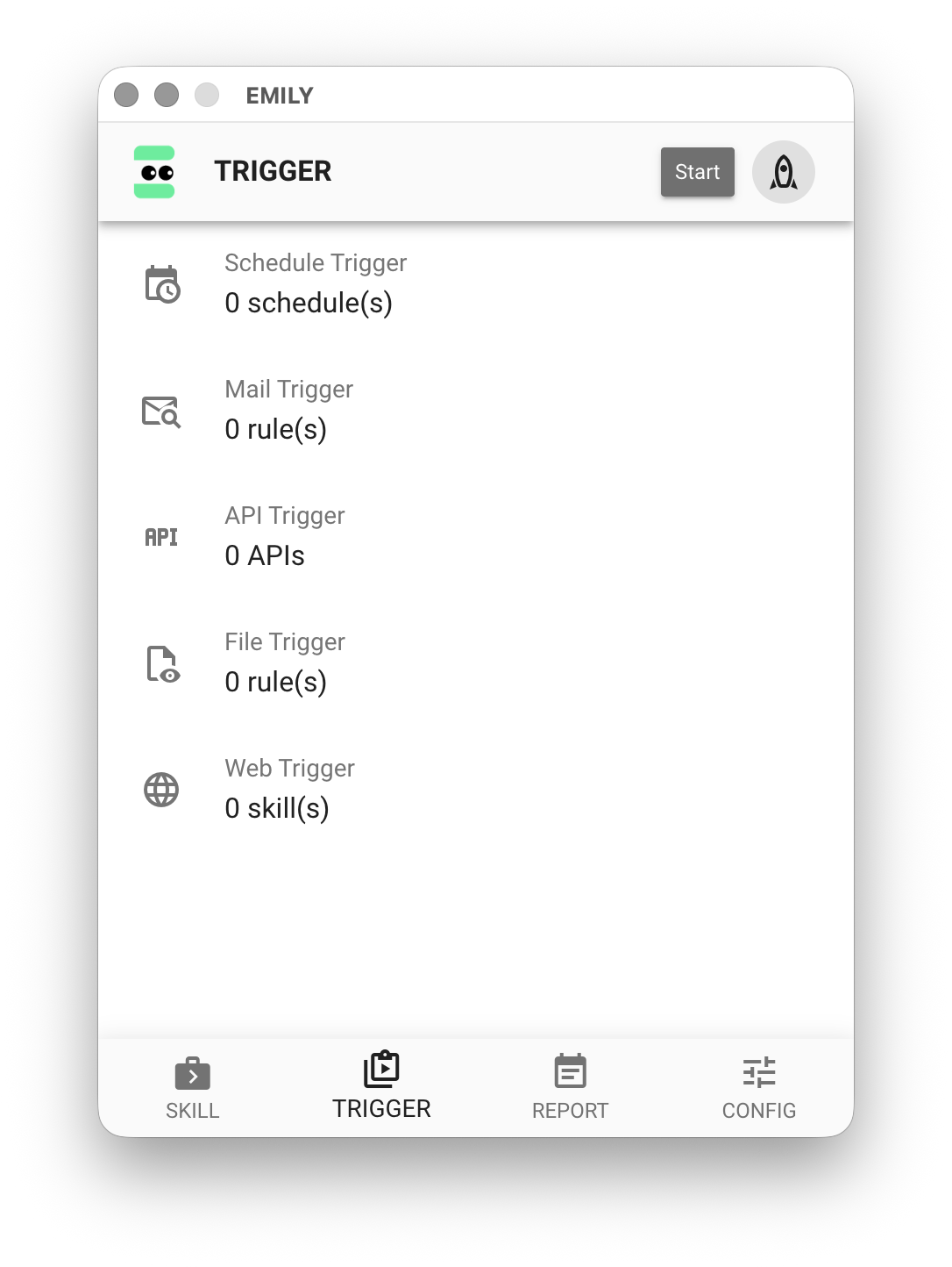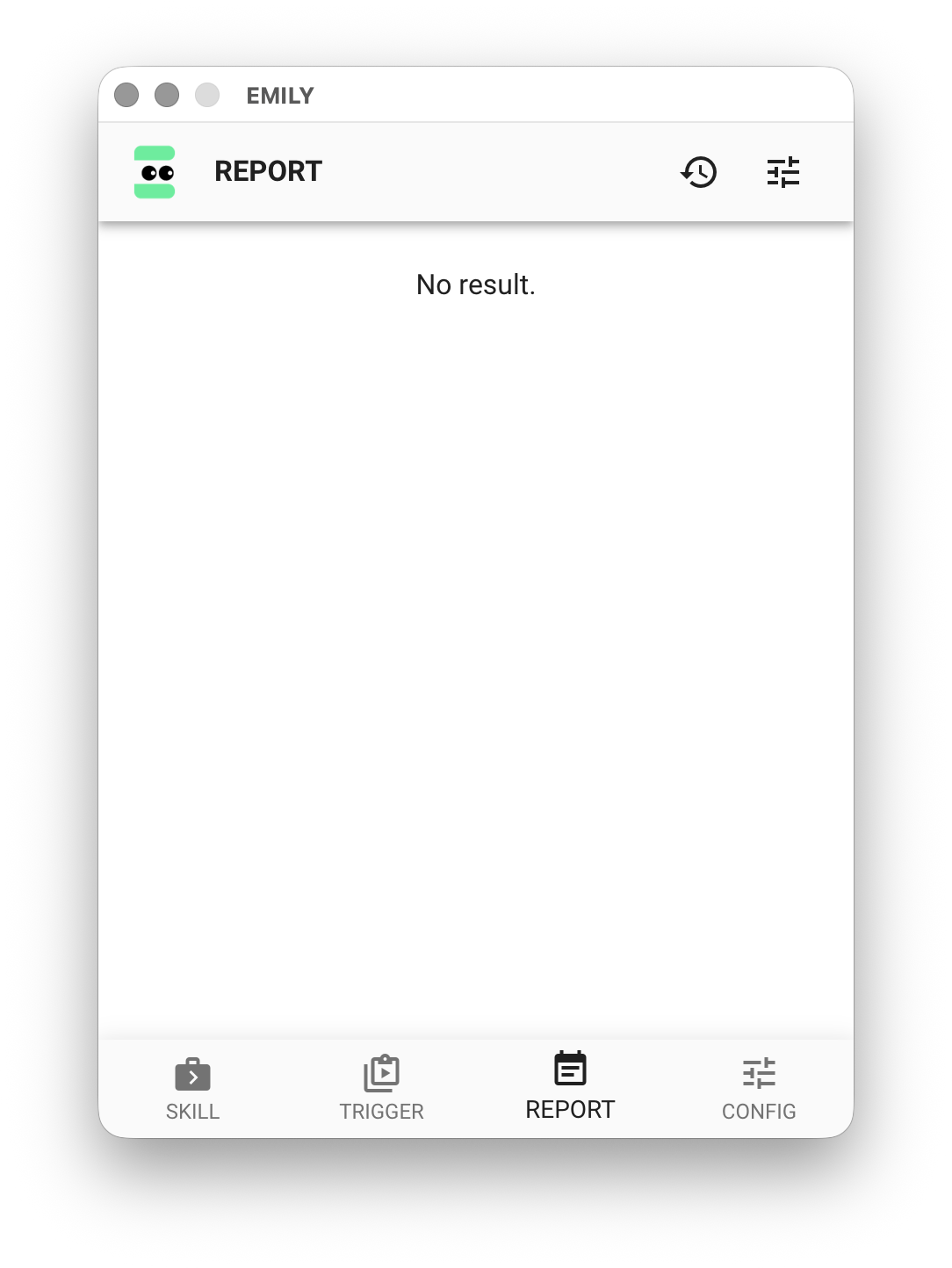 The footer of the EMILY.RPA main interface serves as the primary navigation area, allowing you to switch between four pages: "SKILL", "TRIGGER", "REPORT", and "CONFIG". The header and content change accordingly. As information accumulates with use, you can drag the left or right edge of the window to increase its width, but the height is fixed.