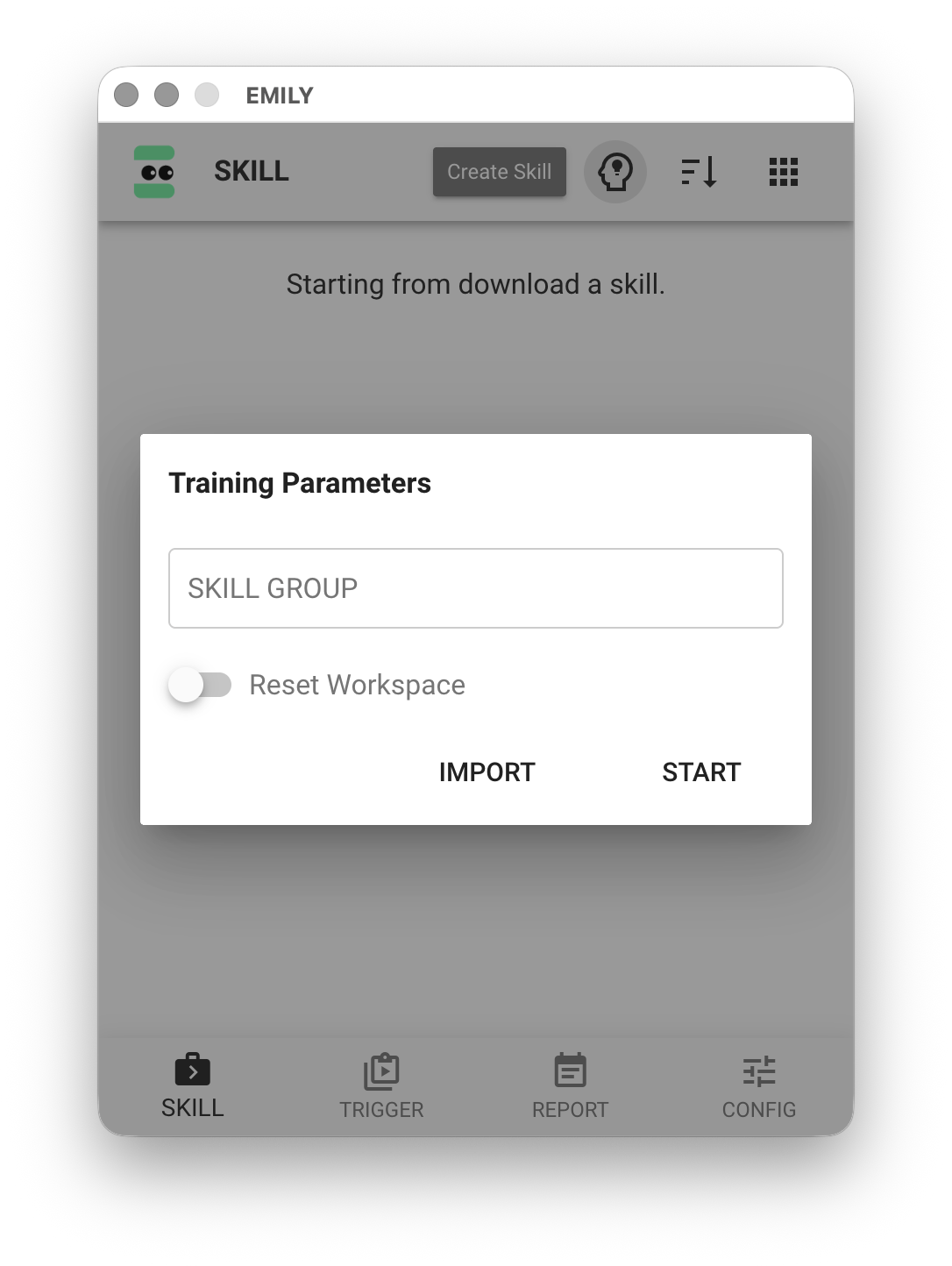 EMILY.RPA refers to "automation workflows" as "Skills", and the "SKILL" page is where you manage all skills on your local machine. Clicking the "Create Skill" icon in the header enters Training Mode; press ESC or click outside the dialog to cancel. In the "Training Mode Settings", you can name the Skill Group that a skill belongs to — a blank name is also a valid group. Skills in the same group share the same browser cookie database, which is useful for websites that require login, as these sites typically write login state to cookies to maintain the session. Each time a skill is executed in EMILY.RPA, a corresponding "Working Folder" is assigned. During Training Mode, the Working Folder is fixed to a folder named tmp — this simplifies managing and reusing input/output files while developing skills. The Reset Workspace option deletes all files in the tmp folder. However, in Execution Mode, each skill run generates its own dedicated Working Folder to isolate results from different runs and allow users to trace back and access the input/output files of each execution.