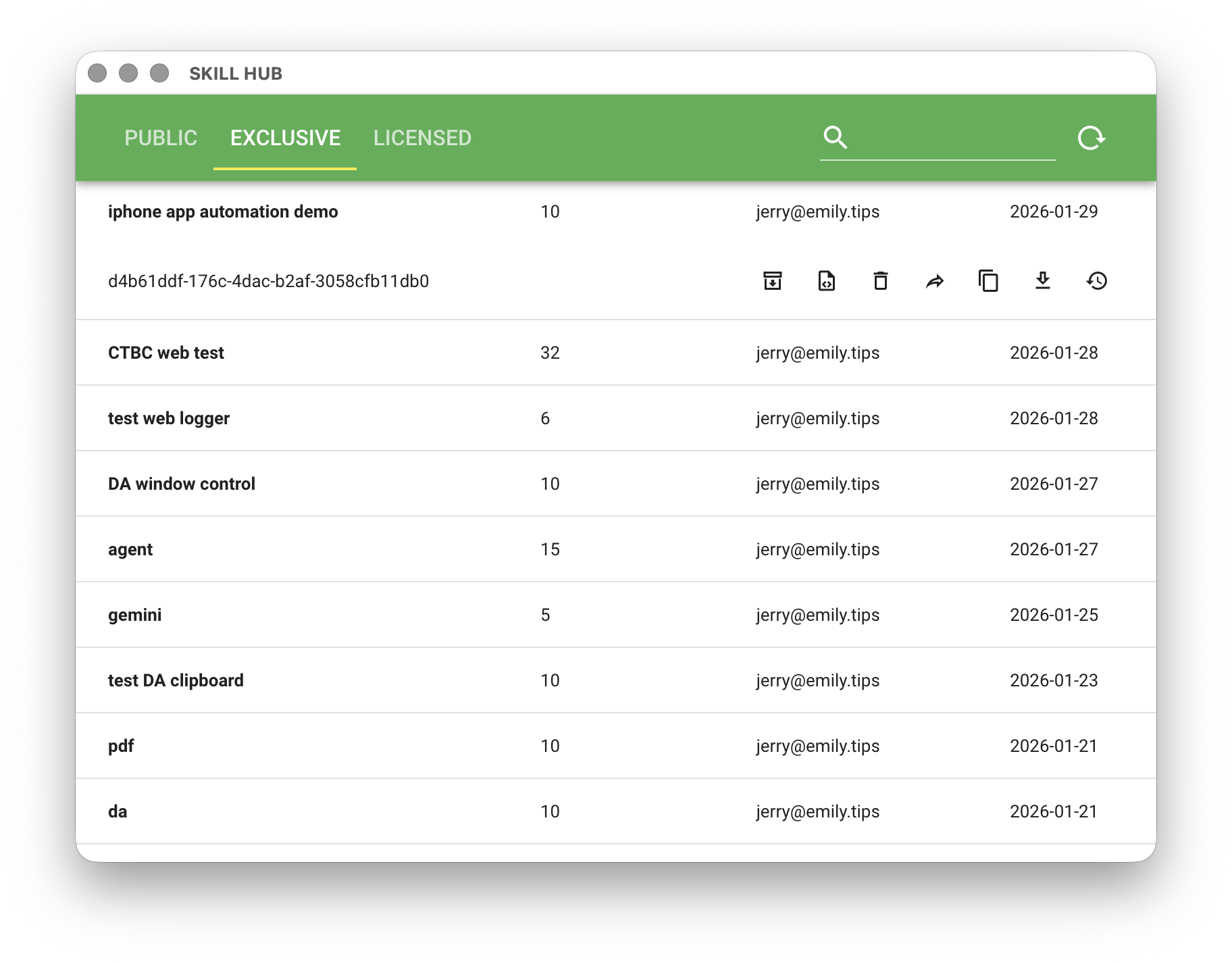 The "Download Skill" icon in the "SKILL" header is the entry point to the Skill Hub. The Skill Hub stores all skills developed by the user, as well as skills shared by other users in the enterprise group. Skills deleted locally can be re-downloaded and reinstalled from the Skill Hub. If you have subscribed to an enterprise group, each skill upload is added to the version history, enabling version control.