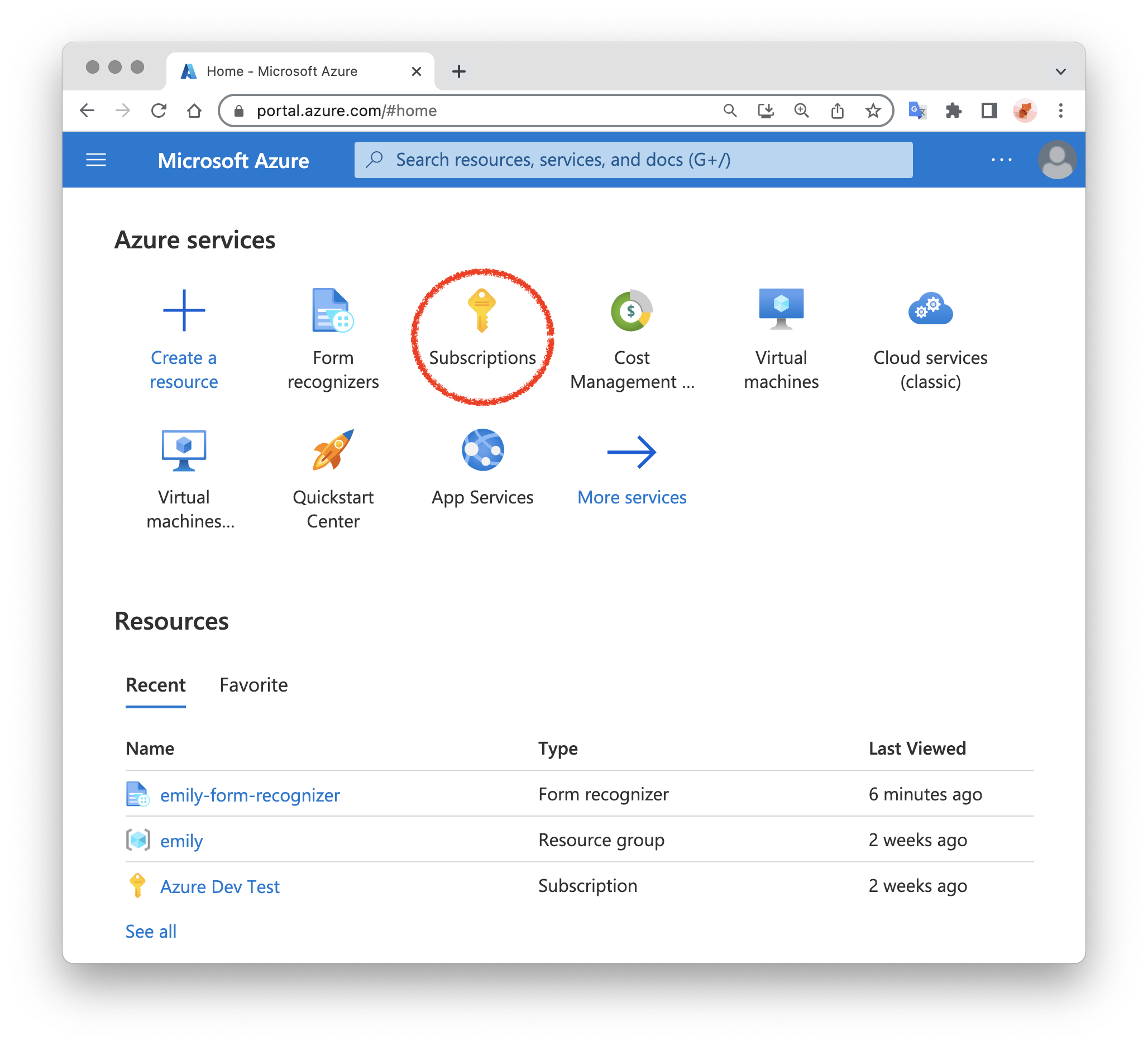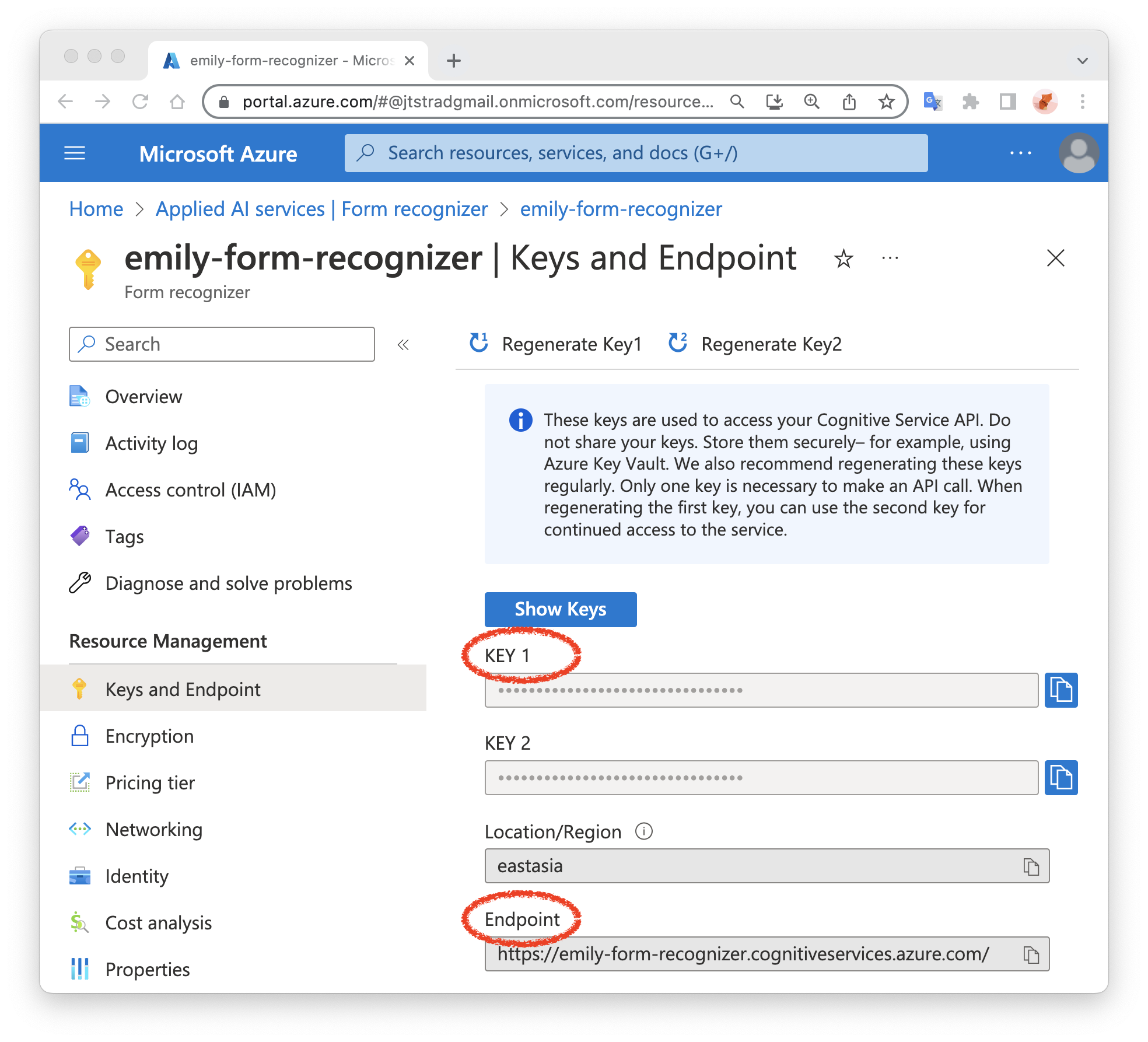 Finally, save the endpoint and key of the created Form Recognizer service for later use: