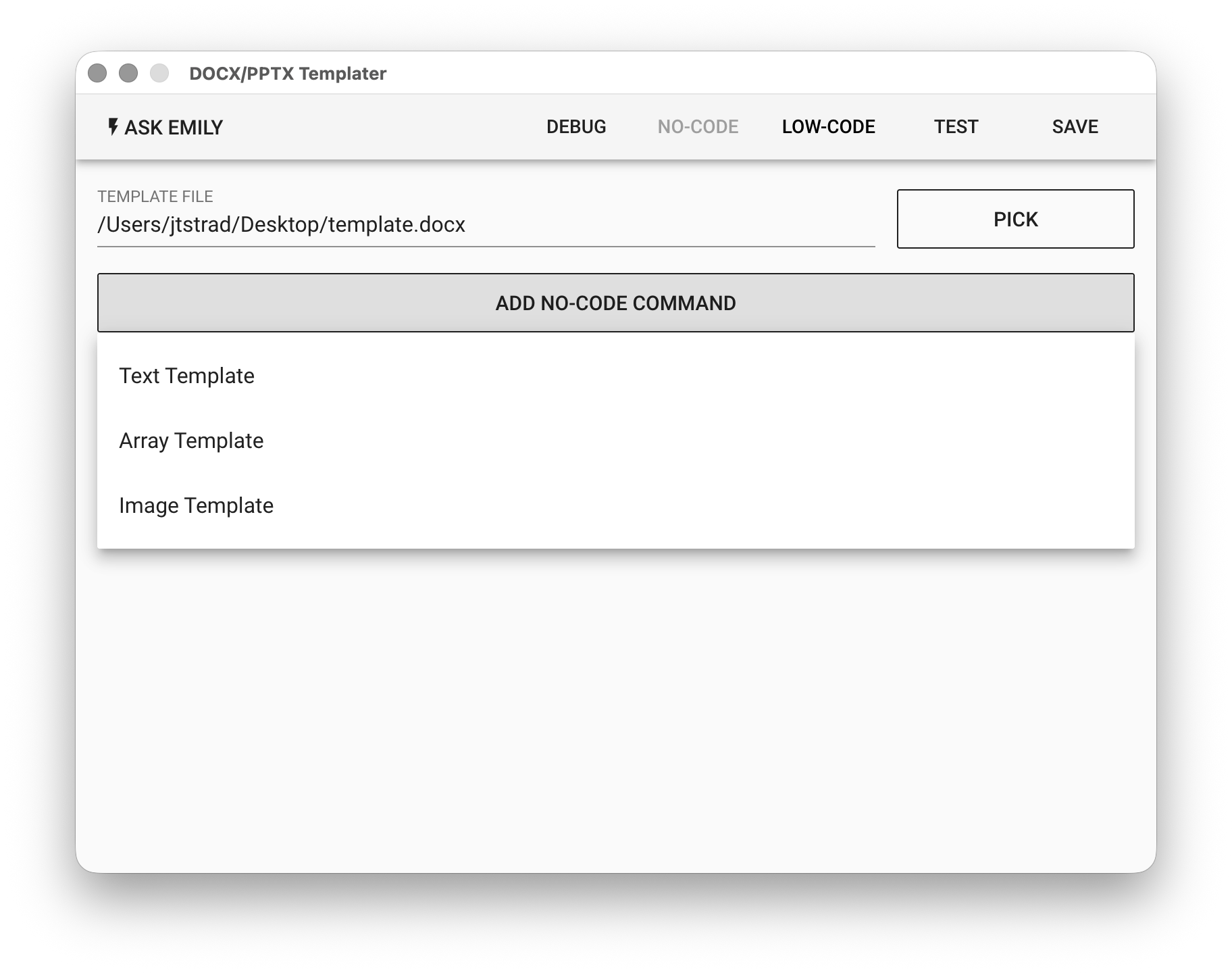 DOCX/PPTX TEAMPLTE - The DOCX/PPTX template file used to generate dynamic content. Click "PICK" to select or use the %FILENAME% variable.