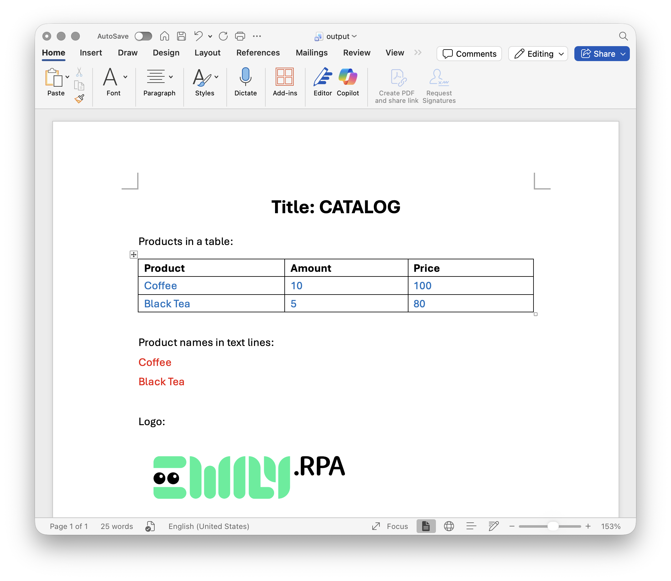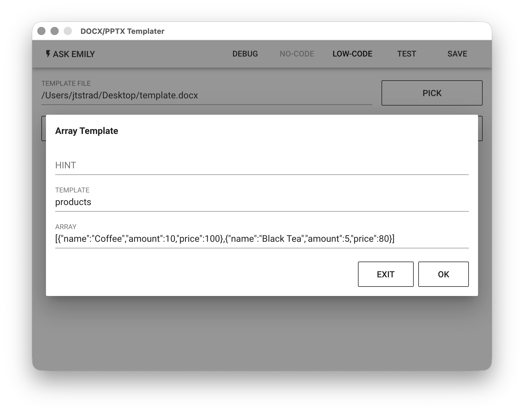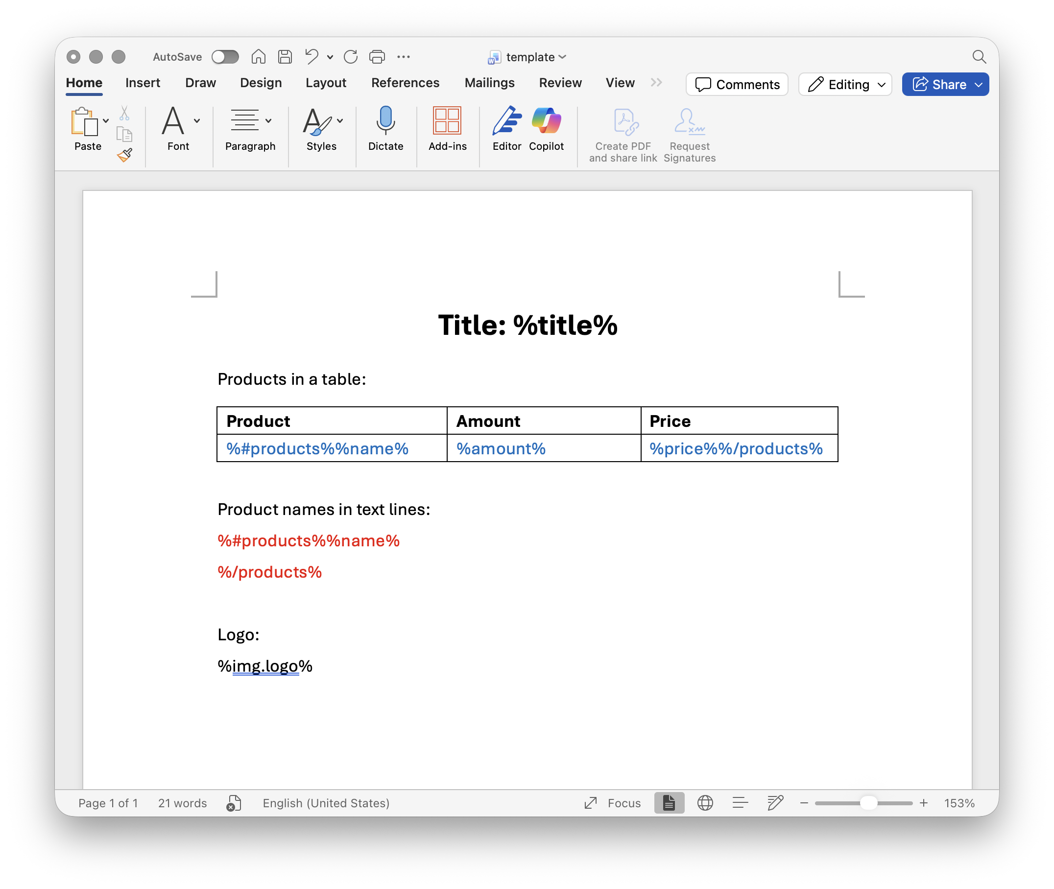 // The DOCX template file defines %title% and %#products% %name% %amount% %price% %/products%