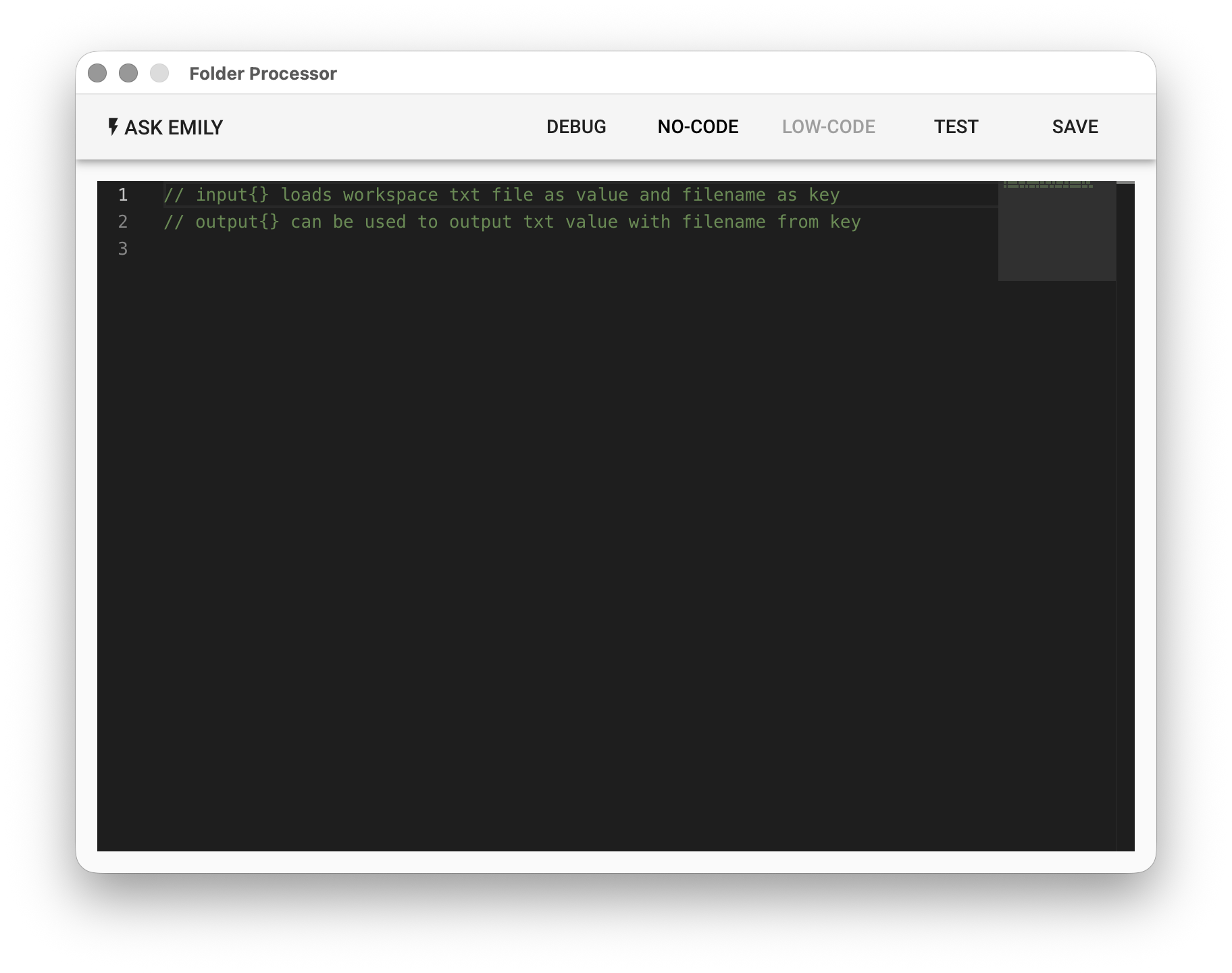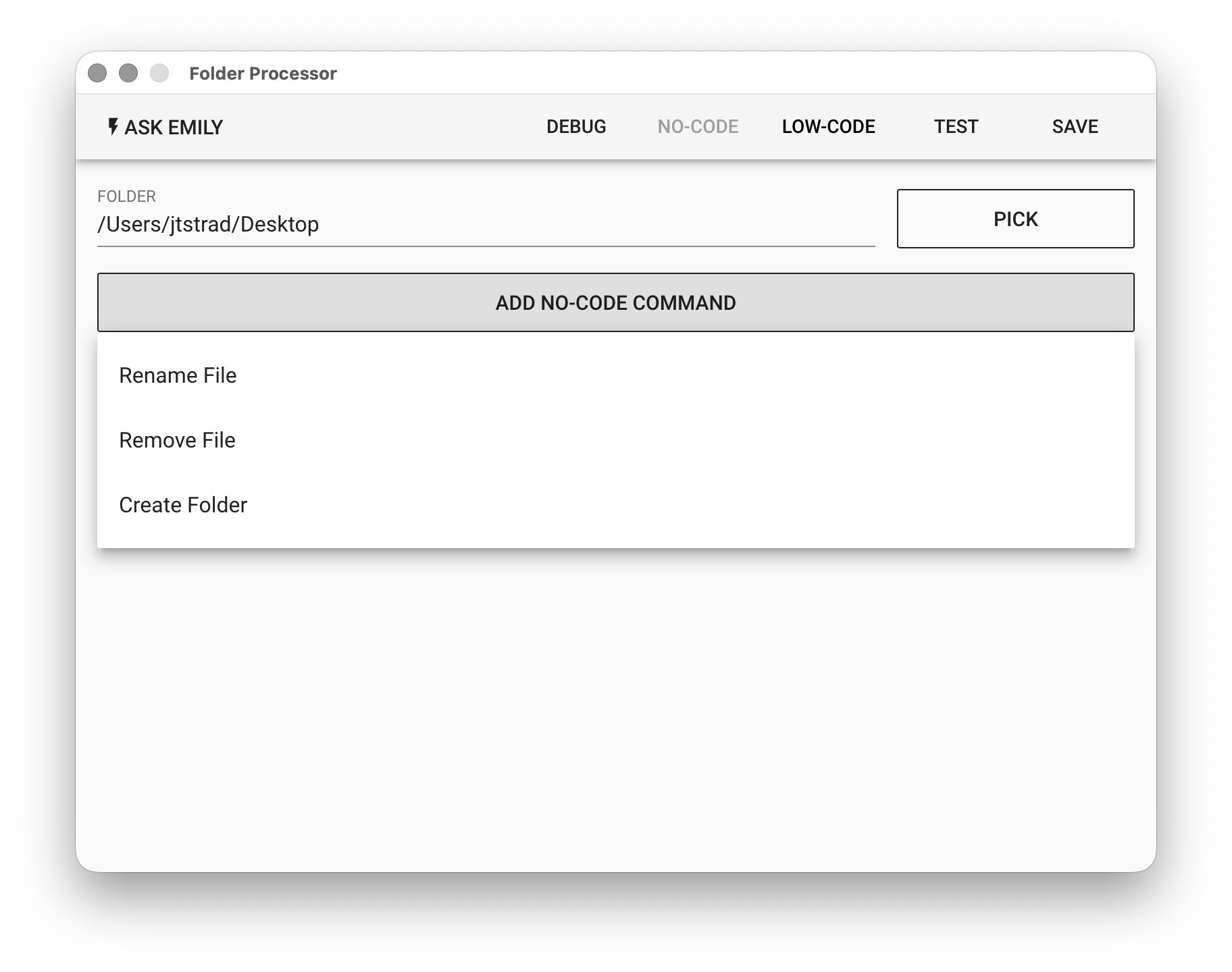 Provides no-code commands such as: "Rename File", "Delete File", "Create Folder", etc. For example, rename the file output.csv to order.csv in the specified folder.